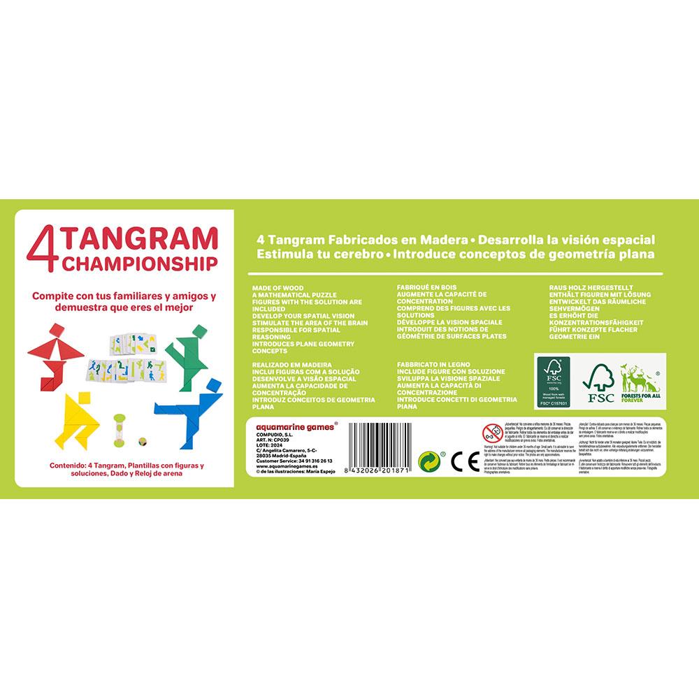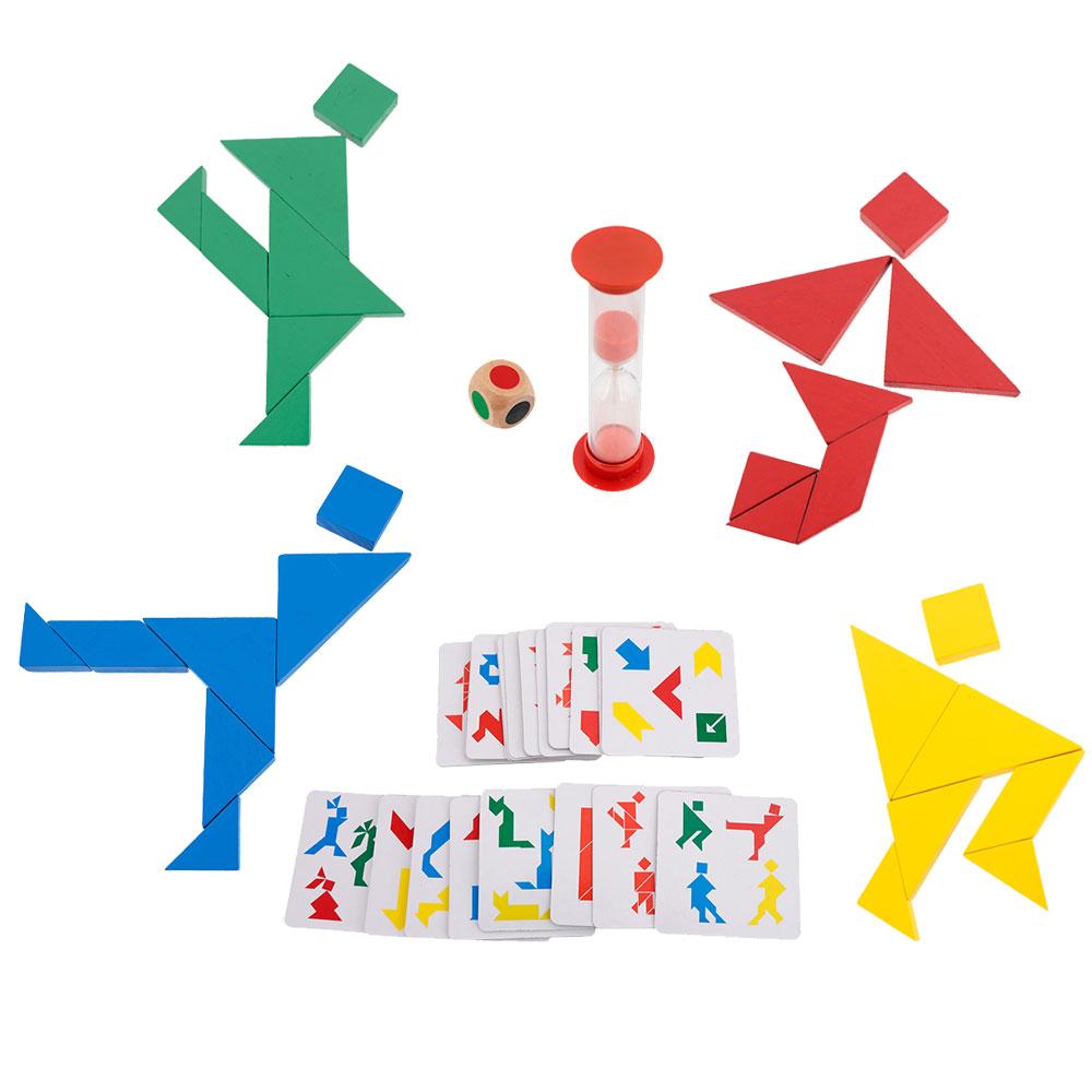 En juego contiene 4 tangram, 25 tarjetas con modelos, un dado, un reloj