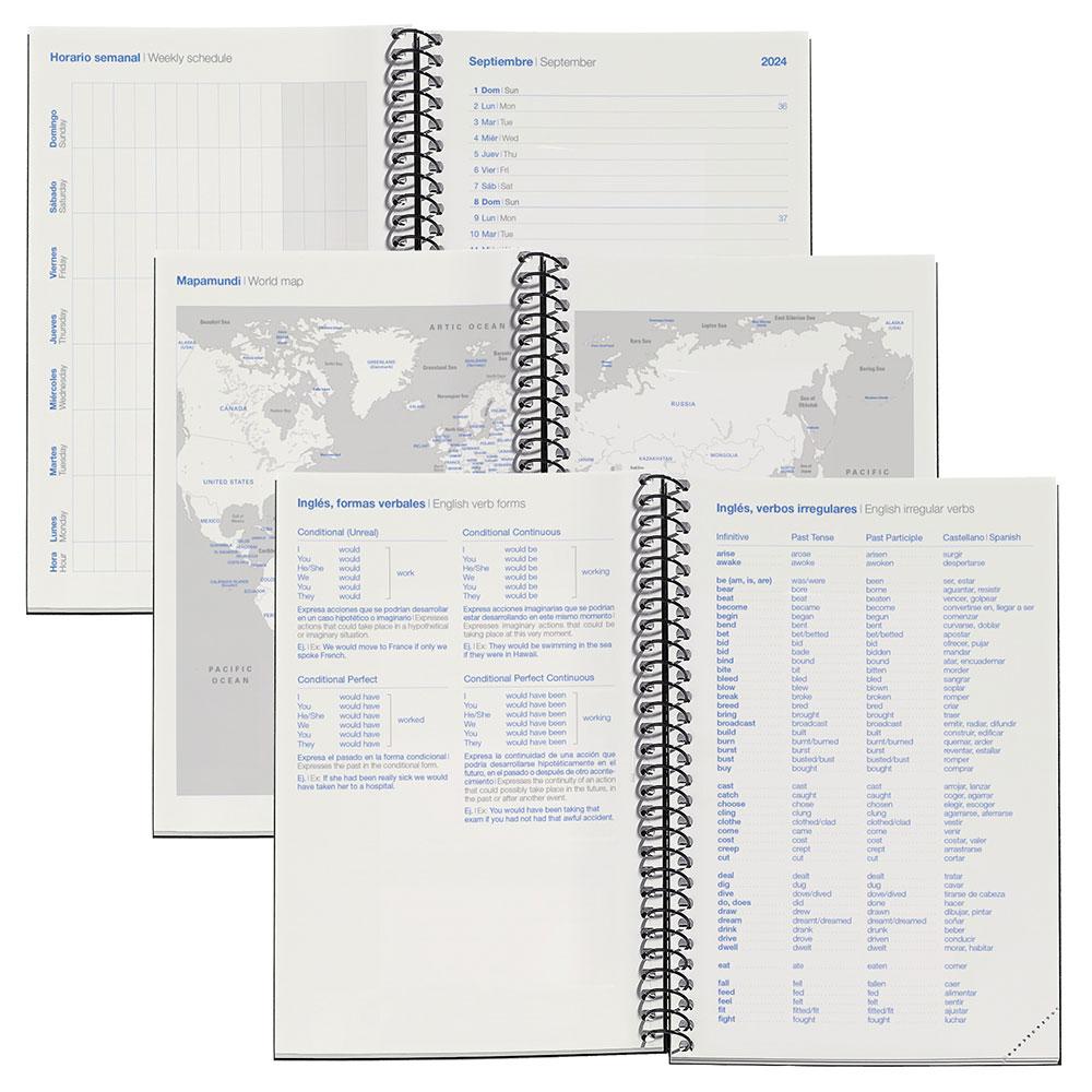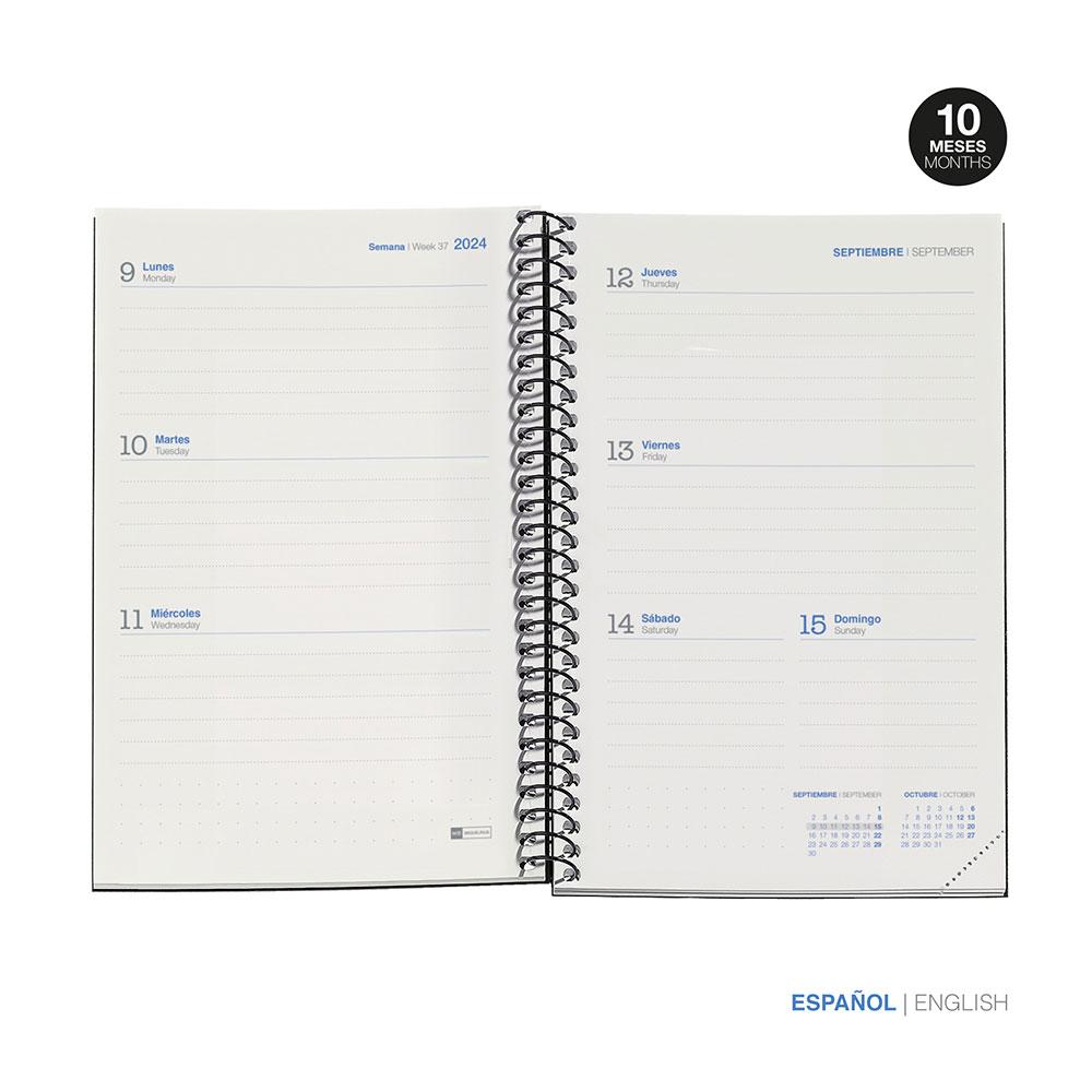 La organización interior de la agenda va de septiembre de 2024 a junio de 2025 en formato semana vista, y los meses de julio y agosto 2025 en formato 2 semanas vista.