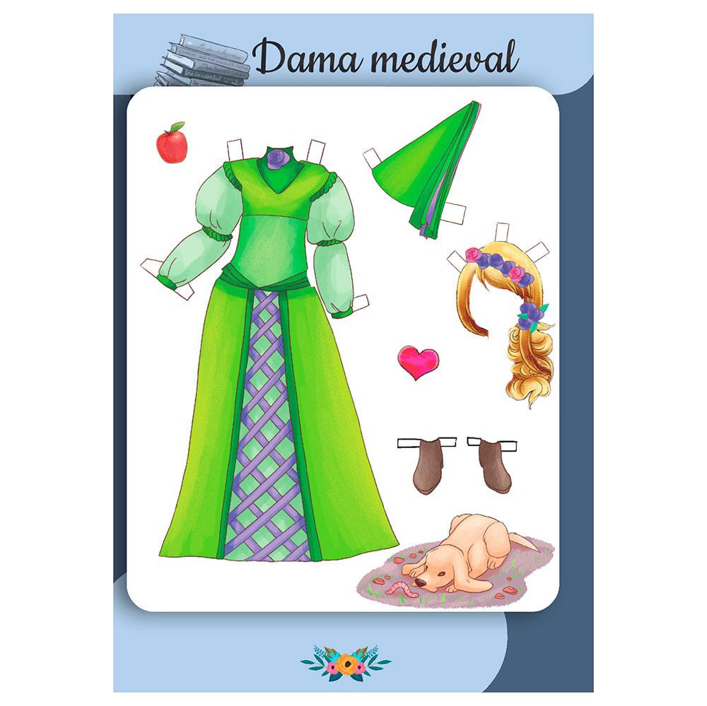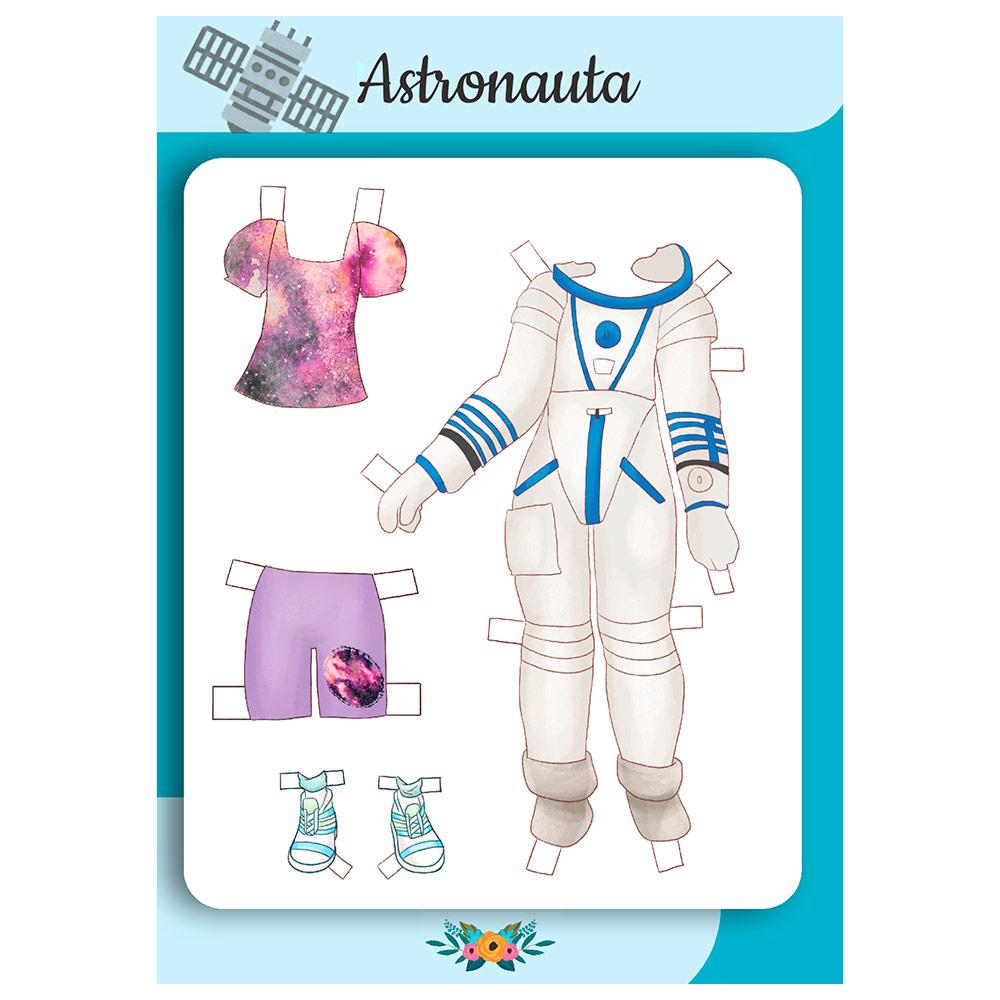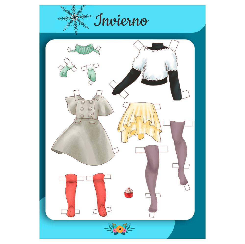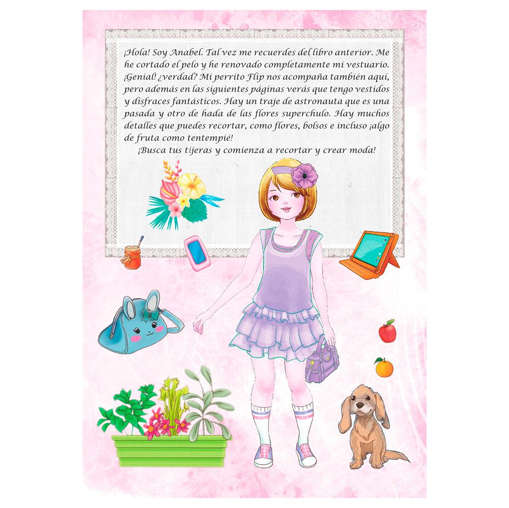 Mi perrito Flip nos acompaña también aquí, pero además en las siguientes páginas verás que tengo vestidos y disfraces fantásticos. Hay un traje de astronauta que es una pasada y otro de hada de las flores súper chulo. Hay muchos detalles que puedes recortar, como flores, bolsos e incluso ¡algo de fruta como tentempié!