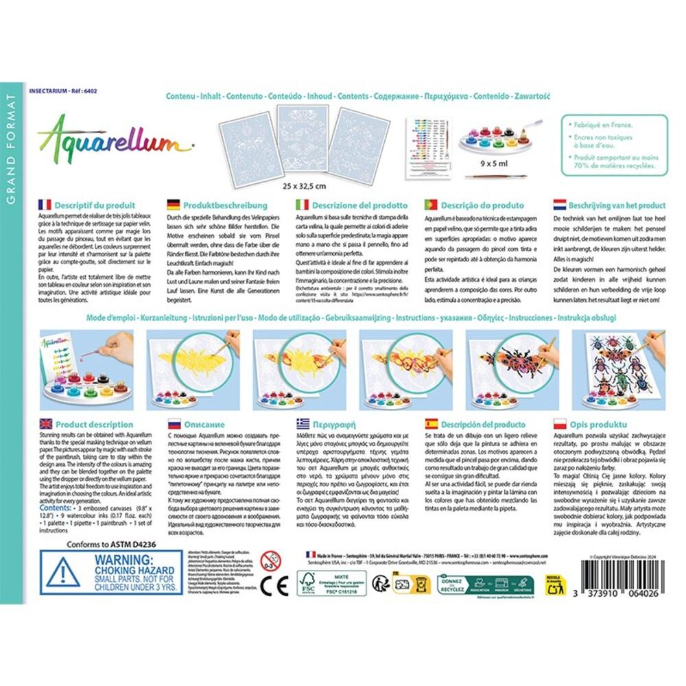 Contiene 3 láminas de 32,5 x 25cm, 1 pincel, 1 paleta para mezclas, 9 botes de acuarela, 1 pipeta para dosificar los clores e instrucciones.