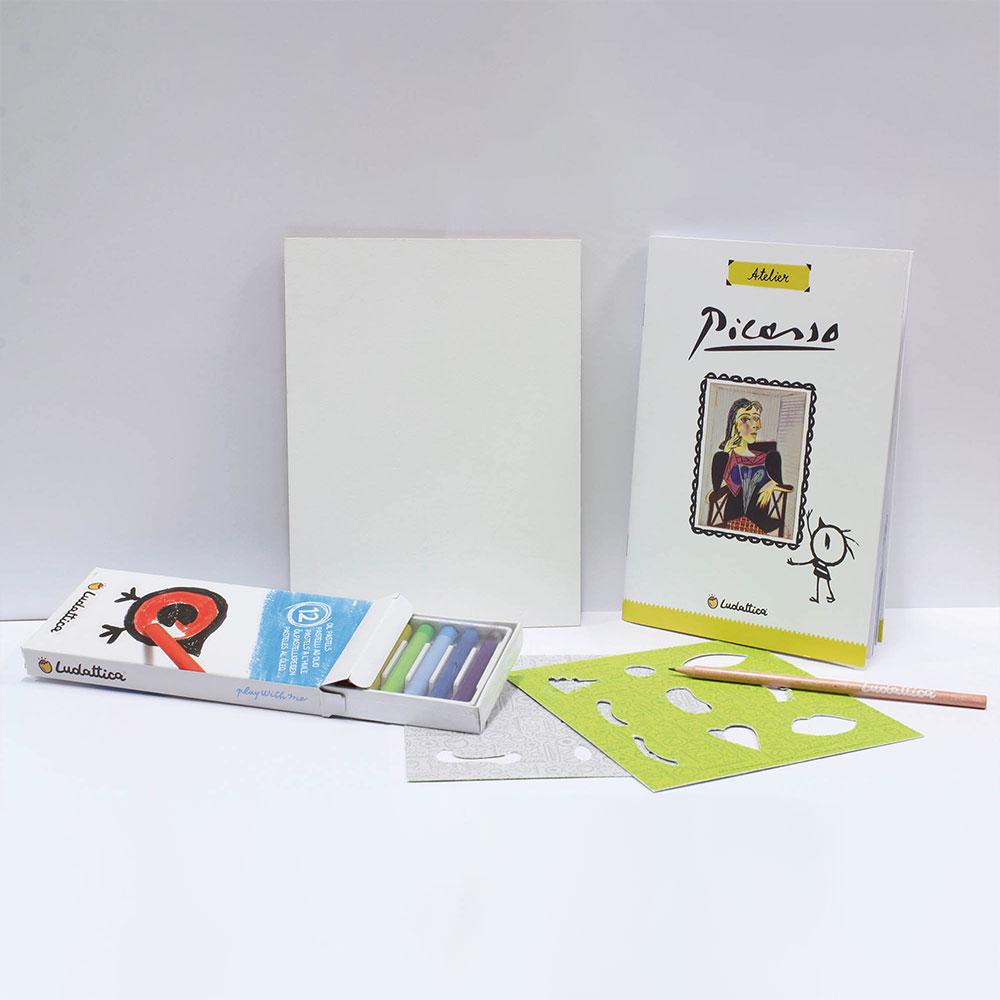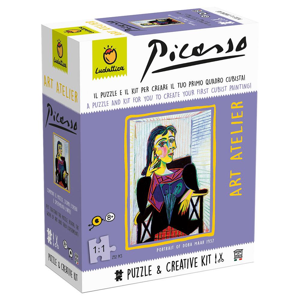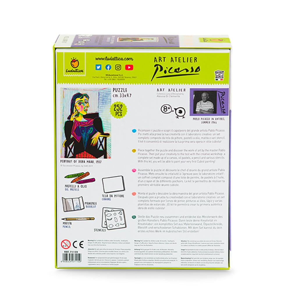 En esta alucinante escuela de pintura, ¡Picasso será tu maestro! Construye el rompecabezas de la obra de arte "Retrato de Dora Maar" y después pon a prueba tu creatividad en el Taller de pintura Cubista. Un conjunto completo compuesto por bastidor con lienzo, pintura al temple y pincel. Este kit te permitirá crear una pintura de estilo Cubista -estilo que él mismo inventó-, ¡perfecta para colgar en tu habitación!