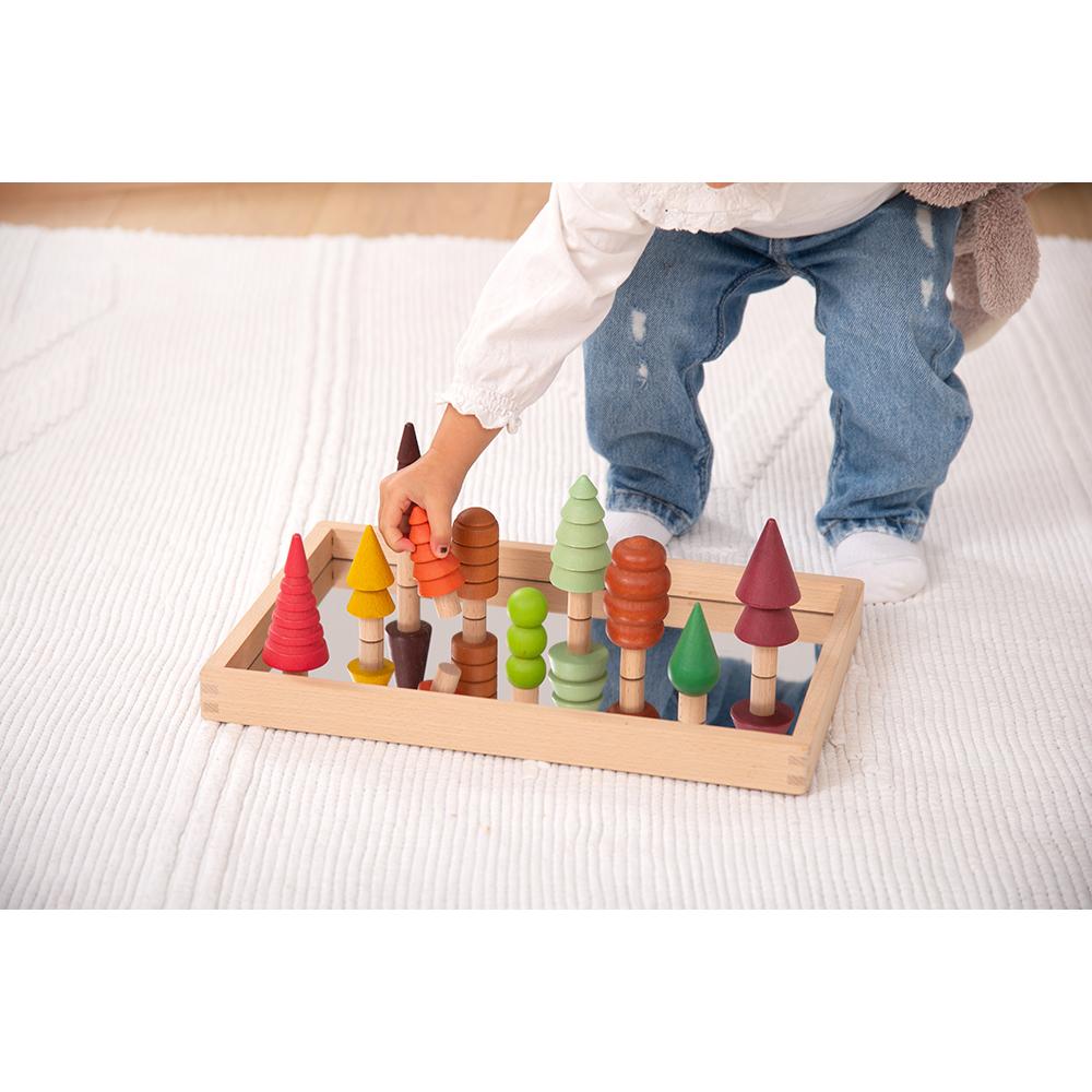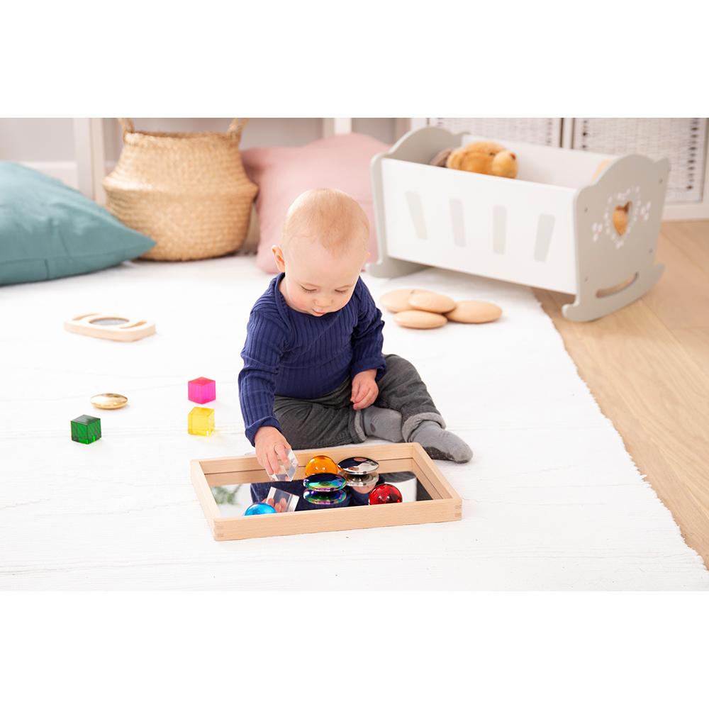 La bandeja espejo de madera es ideal para que los niños y niñas aprendan sobre los efectos de reflejo, puedan observar objetos desde diferentes ángulos, crear entornos de mundo pequeño.