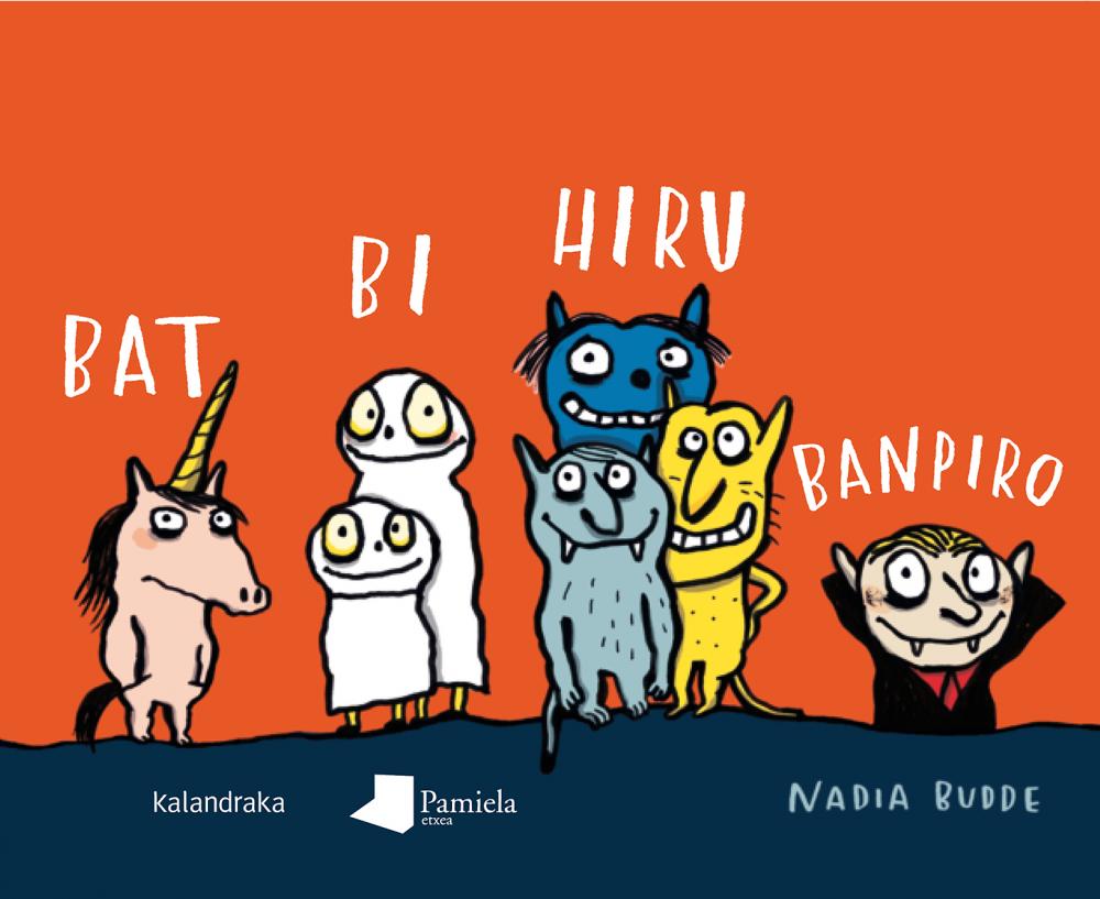 Bat, bi, hiru, banpiro. Rosa, Hektor, Sugoi, Erraldoi. Soinekoa soinean, esmokina aldean, berokia darama, piku-armiarma? Hainbatetan saritua izan den "Bat bi hiru, txiruliru!" horren haritik, proposamen berri honek ere liburuaren eta irakurketaren jolas-dimentsioaren alde egiten du, testuaren eta ilustrazioen uztarketa darabil, errima eta erritmoaren bitartez hitzak eta irudiak ezagutzeko. Liburu honek, nola errepikapenean, hala hainbat egoera eta jokaeratan dauden pertsonaia arraro eta baldarren jolas kateatuan oinarritzen den eskema agertzen du. Oraingo honetan, orriotan ageri den figura-saila bere itxura beldurgarria dela-eta nabarmentzen da: banpiroak, mamuak, munstroak eta eskeletoak, lehenengo begiratuan, behintzat, desatseginak edo arriskutsuak diren edo zori txarrari loturik dauden animaliekin batzen dira, hala nola, kaparrak, sugeak, marrazoak, krokodiloak, katu beltzak edo saguzarrak. Nolanahi ere, bete-betean gu harrapatu eta irribarrea eragiten digun begirada samurra, amultsua eta burlatia agertzen dute. Nola humoreak eta trazu gogorreko ilustrazio koloretsuek, hala borobilduriko bazterrez osaturik dagoen kartoizko formatuak ere, liburu soil-soila izatetik haratago, ikasteko eta jolaserako bidea eskaintzen duen objektu erabilgarri bilakatzen dute, aurre-irakurleen eta lehen irakurleen komunikazio gaitasuna garatzeko aukera paregabea eskaintzen duelarik.
