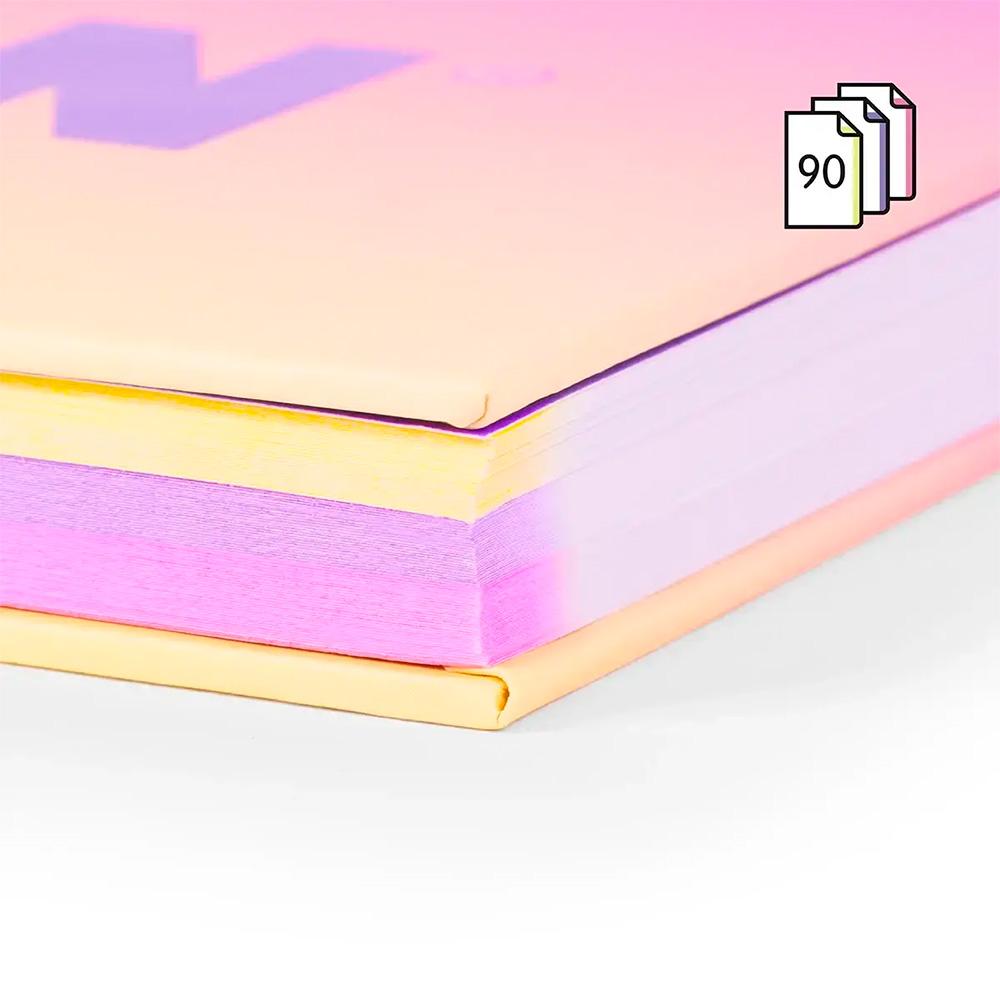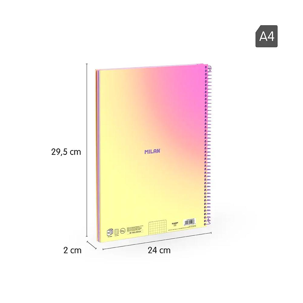 Bloc de tamaño A4 colección Sunset con cubiertas de cartón rígido en tonalidades amarillas degradadas y logotipo de Milan brillante en relieve.