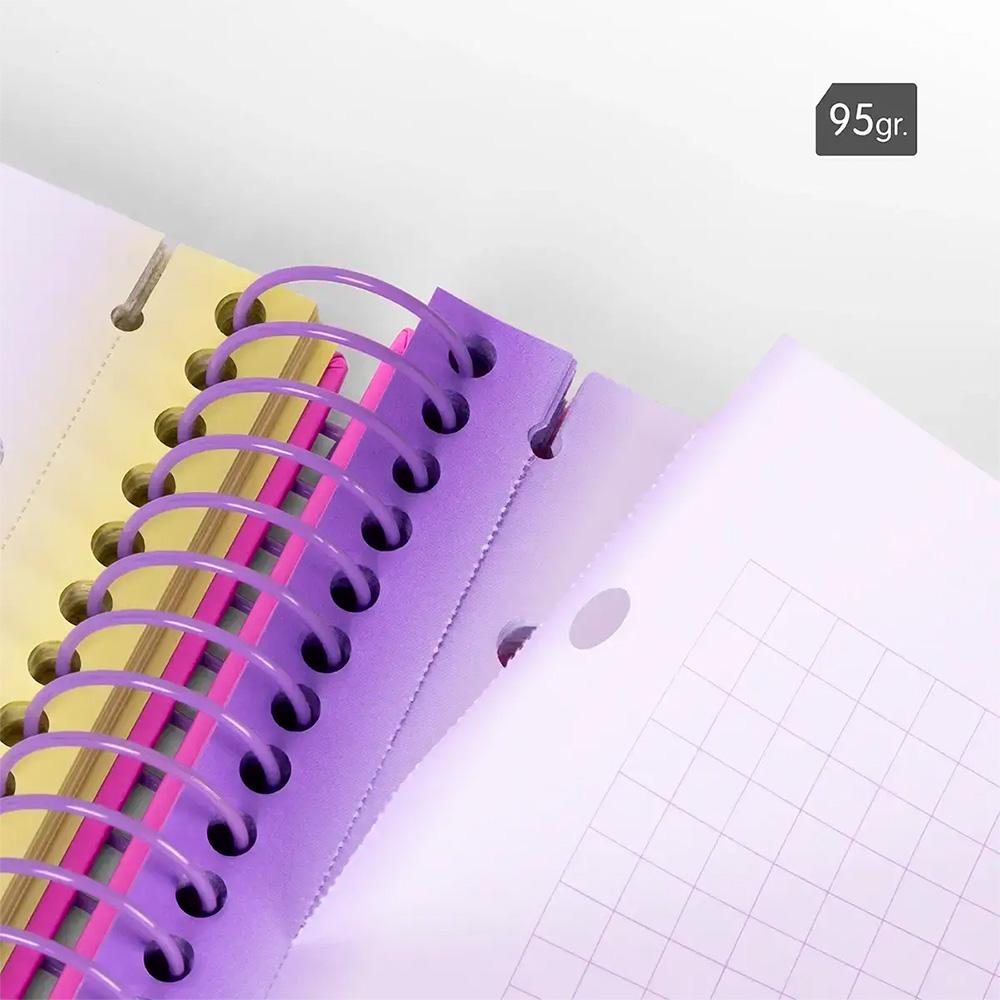 Dispone de espiral metálica resistente y flexible con cierre de seguridad que evita enganches. Contiene 90 hojas de 95 gr/m² microperforadas con cuadrícula 5x5, 4 taladros, 3 bandas de colores (30 hojas por color) y un iniciador de corte para facilitar su separación.