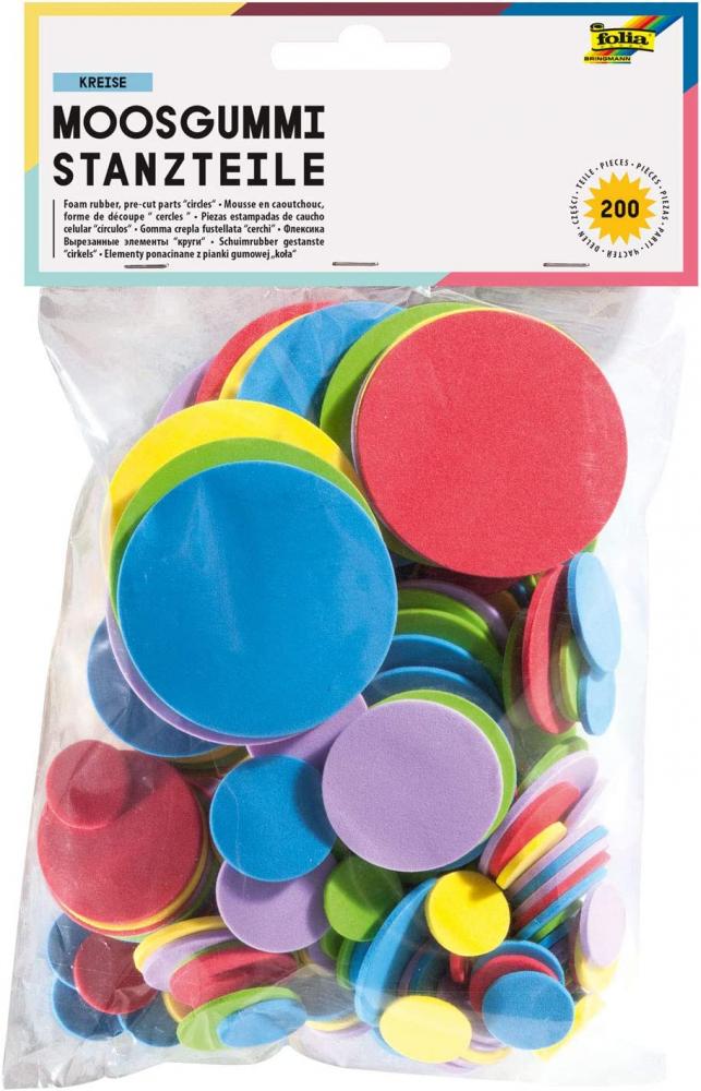 Contiene 200 piezas en forma de círculo de foam en diferentes colores y tamaños.