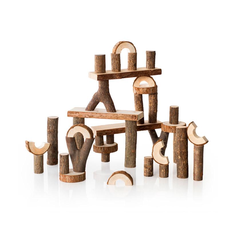 Estos bloques de piezas de madera, cortados con su corteza real, son realmente perfectos para respetar el ritmo evolutivo de cada niño y estimular el juego libre: su sistema de piezas de formas básicas permiten que cada niño o niña establezca la dificultad de la construcción de forma progresiva, ayudando a los pequeños de la casa a comprender mejor las formas y figuras geométricas esenciales, y pasando después a identificar y resolver los principios de la arquitectura y el diseño. Además favorece la exploración sensorial y natural, gracias a sus diferentes texturas de madera real.