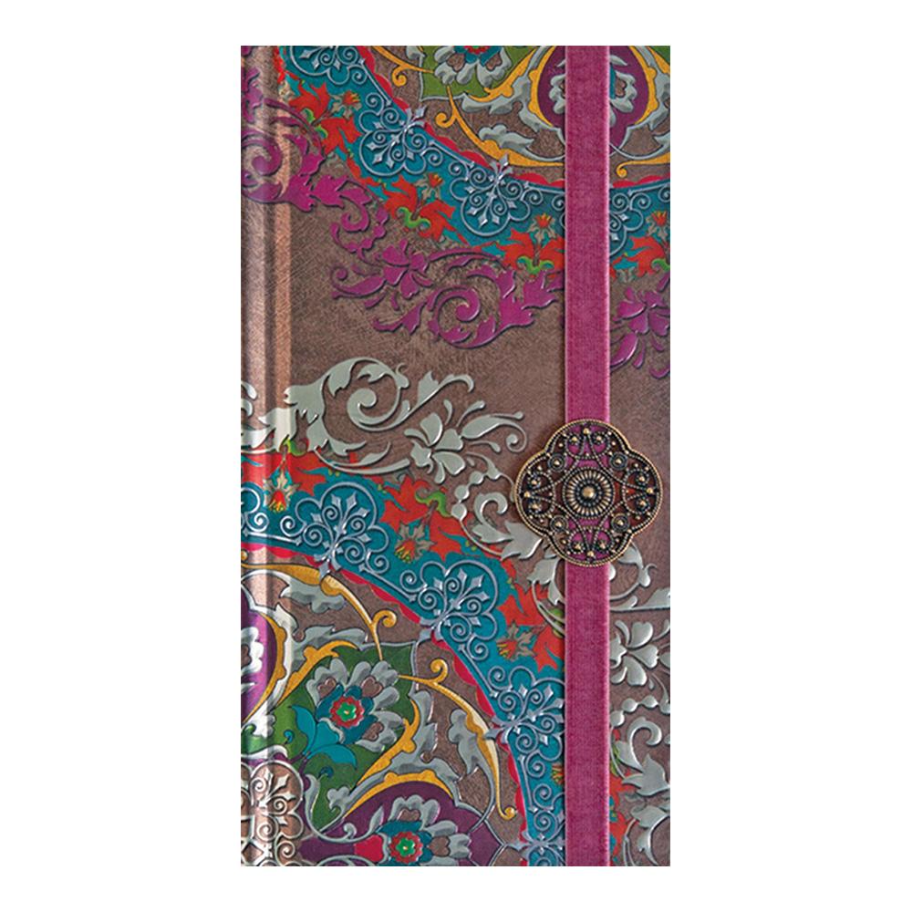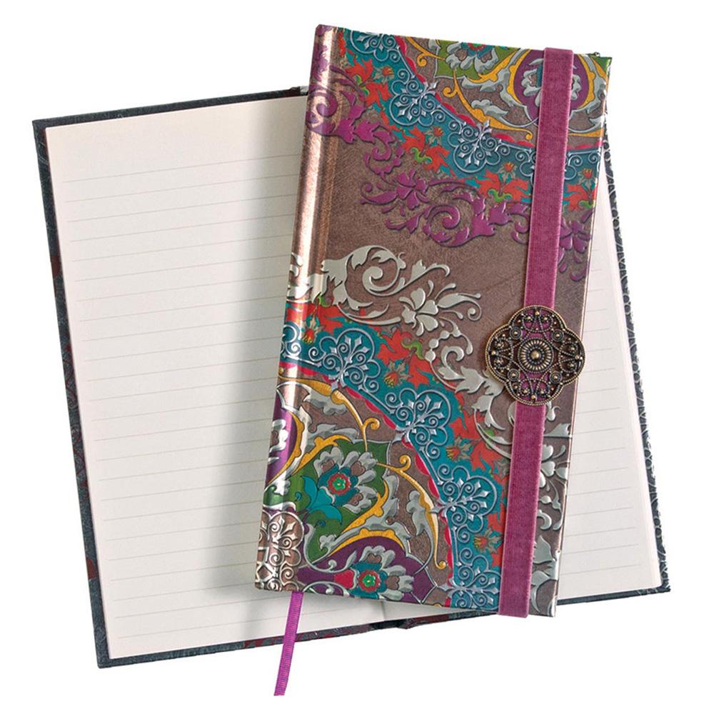 Cuaderno Boncahier con encuadernación con elástico de terciopelo y abalorio. Dispone de hojas con rayado horizontal y cinta marcapáginas.