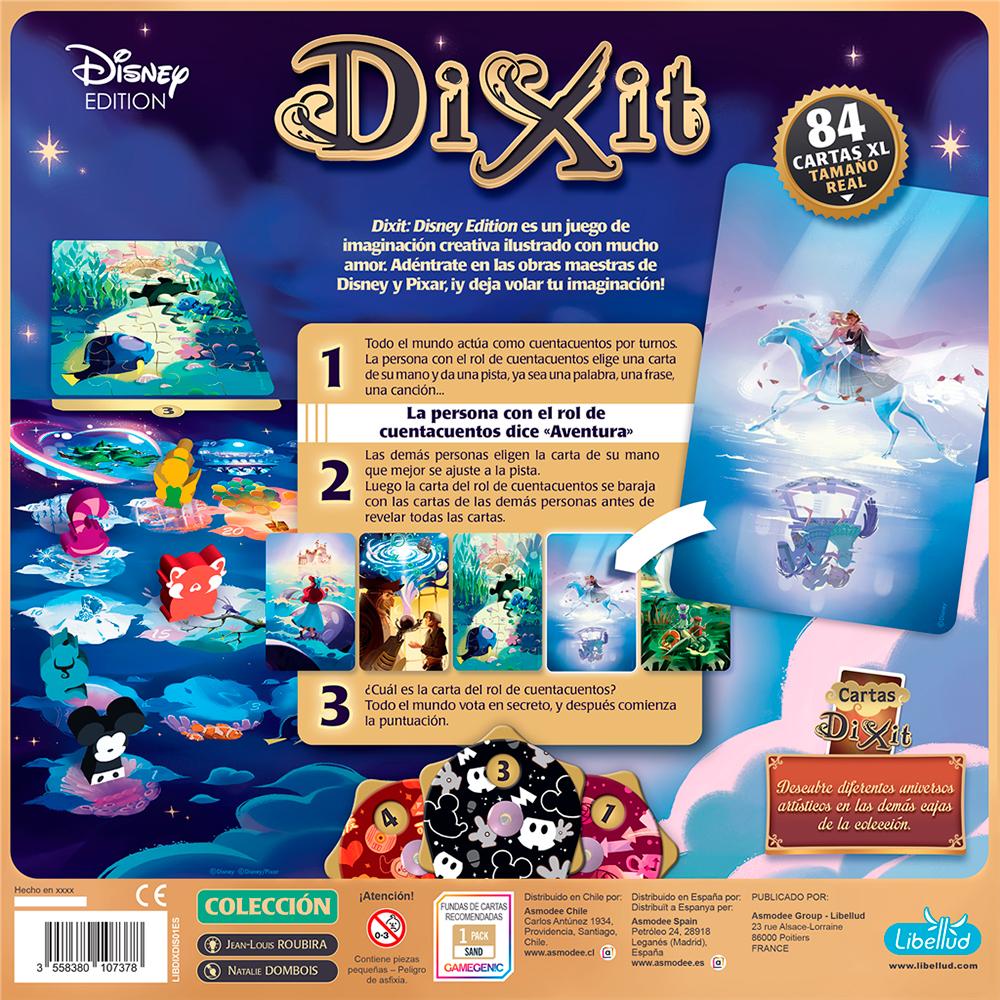 Las mismas reglas de Dixit con nuevo material, de 3 a 6 jugadores, con tablero, diales de votación, fichas de madera... ¡Todo recubierto con la magia de Disney!