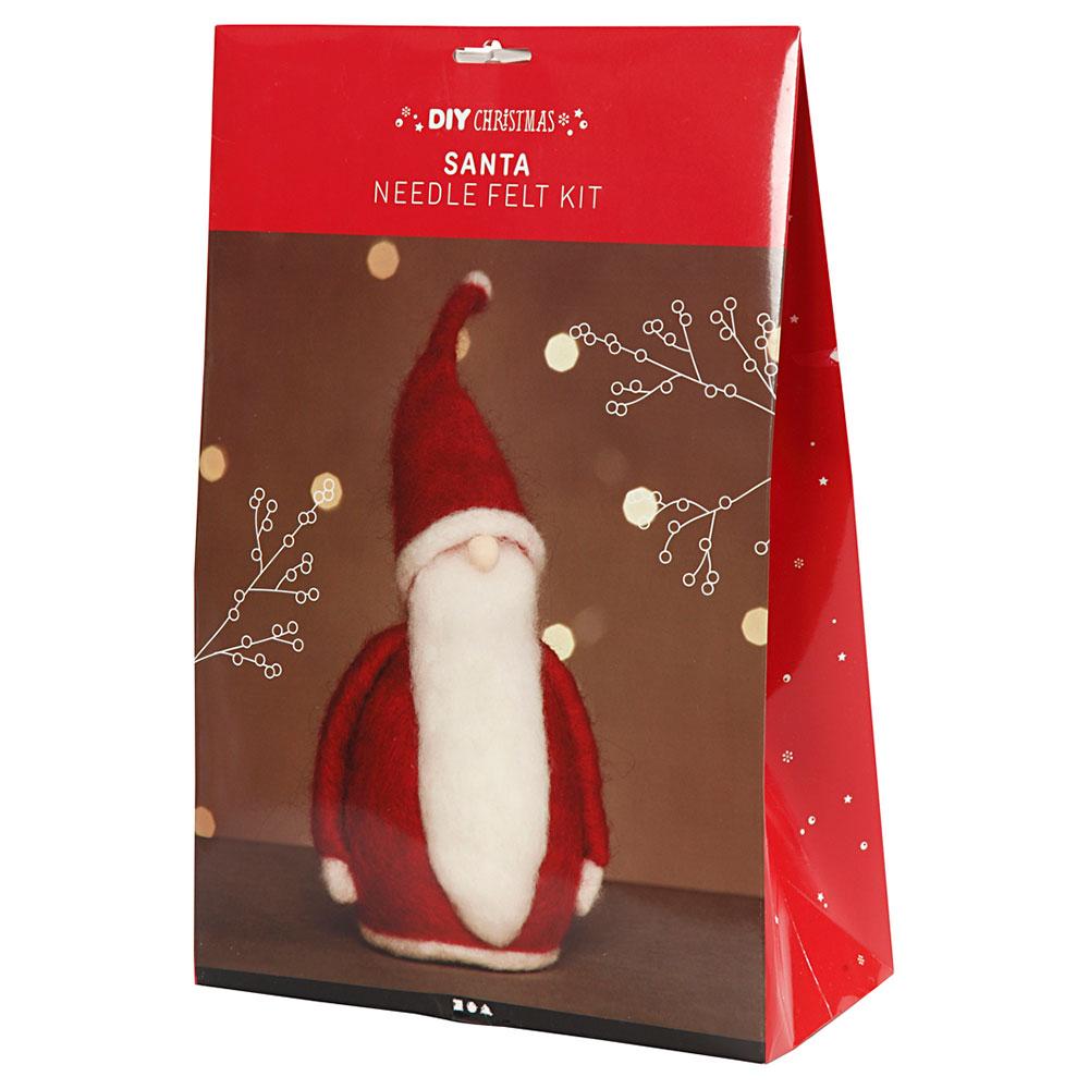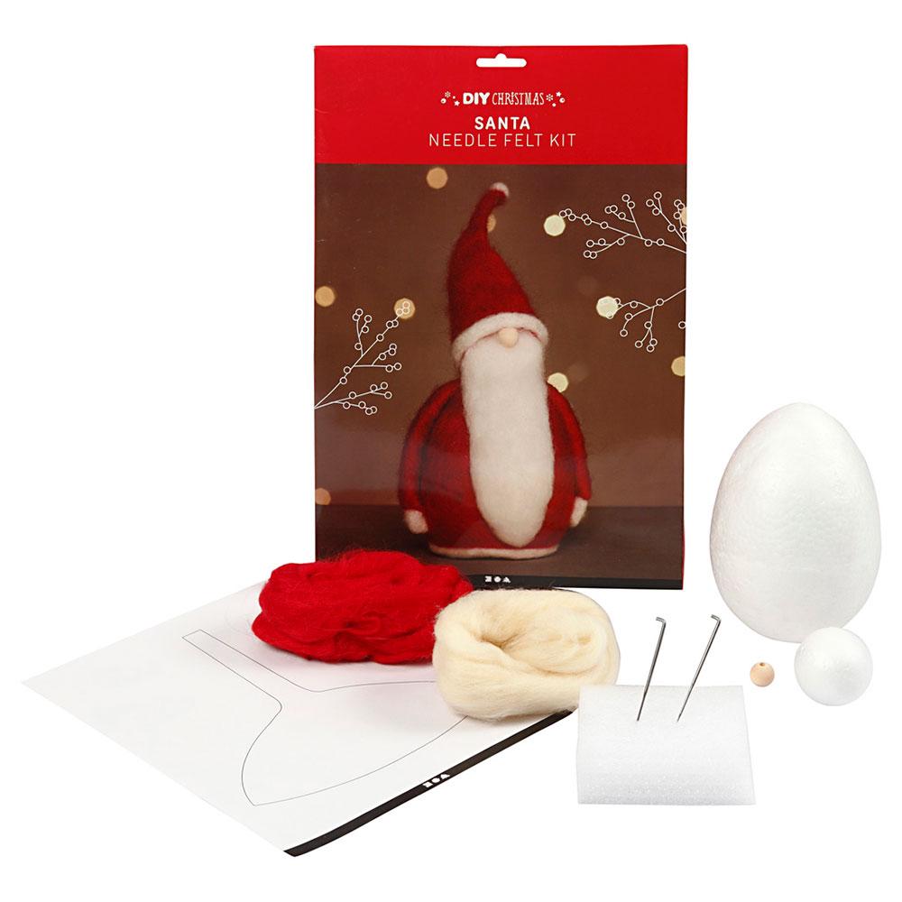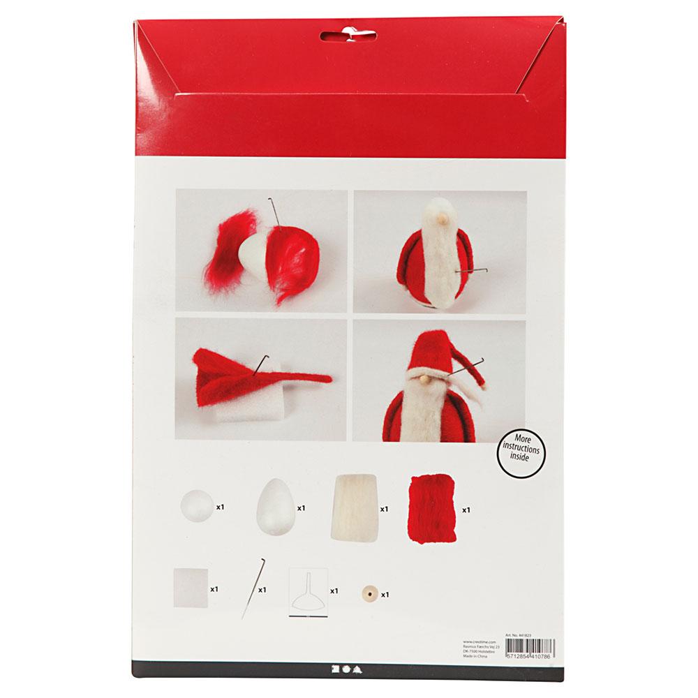 Incluye: lana de color blanco y rojo, bolas de poliestireno para la cara y el cuerpo, cordón de madera, aguja de fieltro, almohadilla de espuma de fieltro con aguja y guía con el paso a paso.