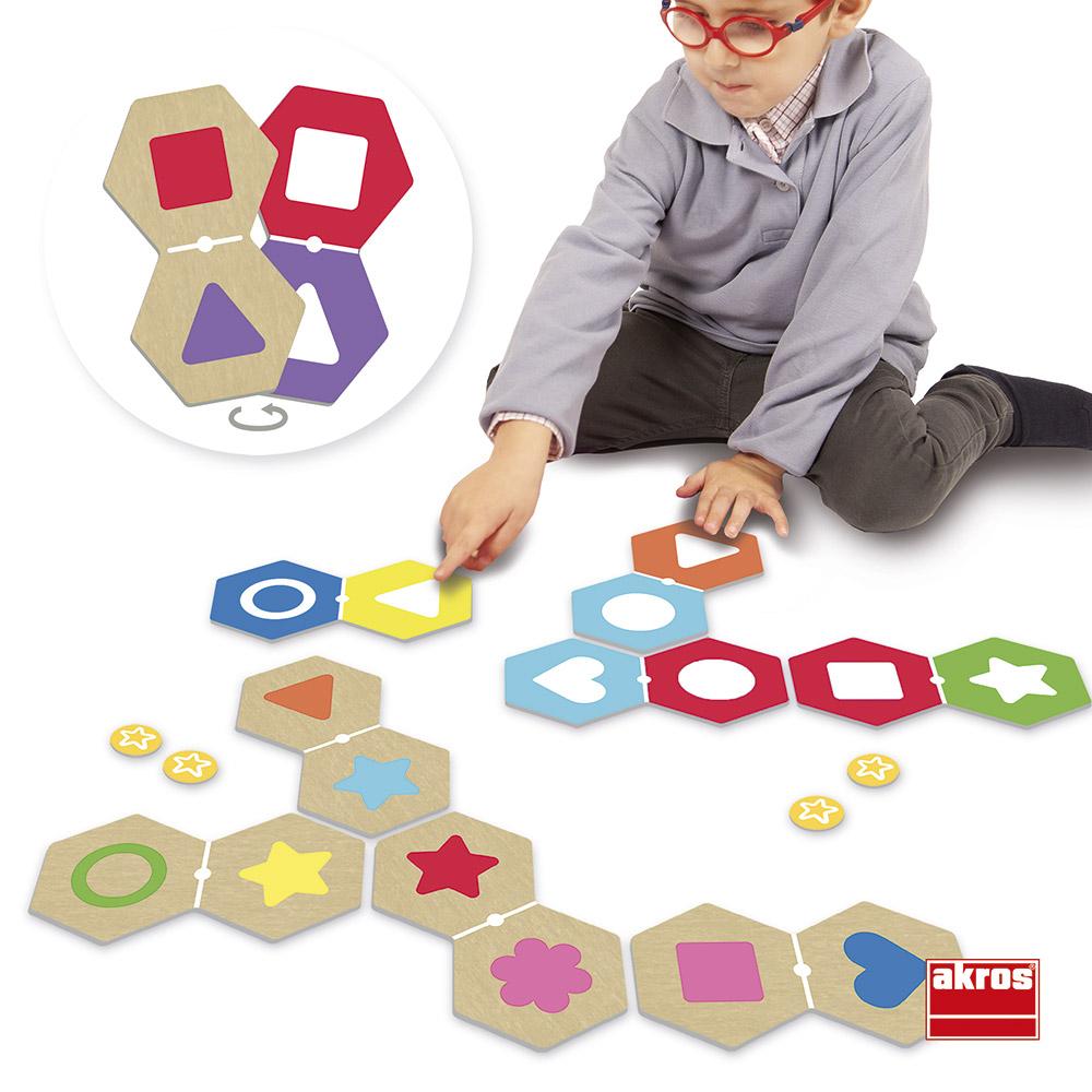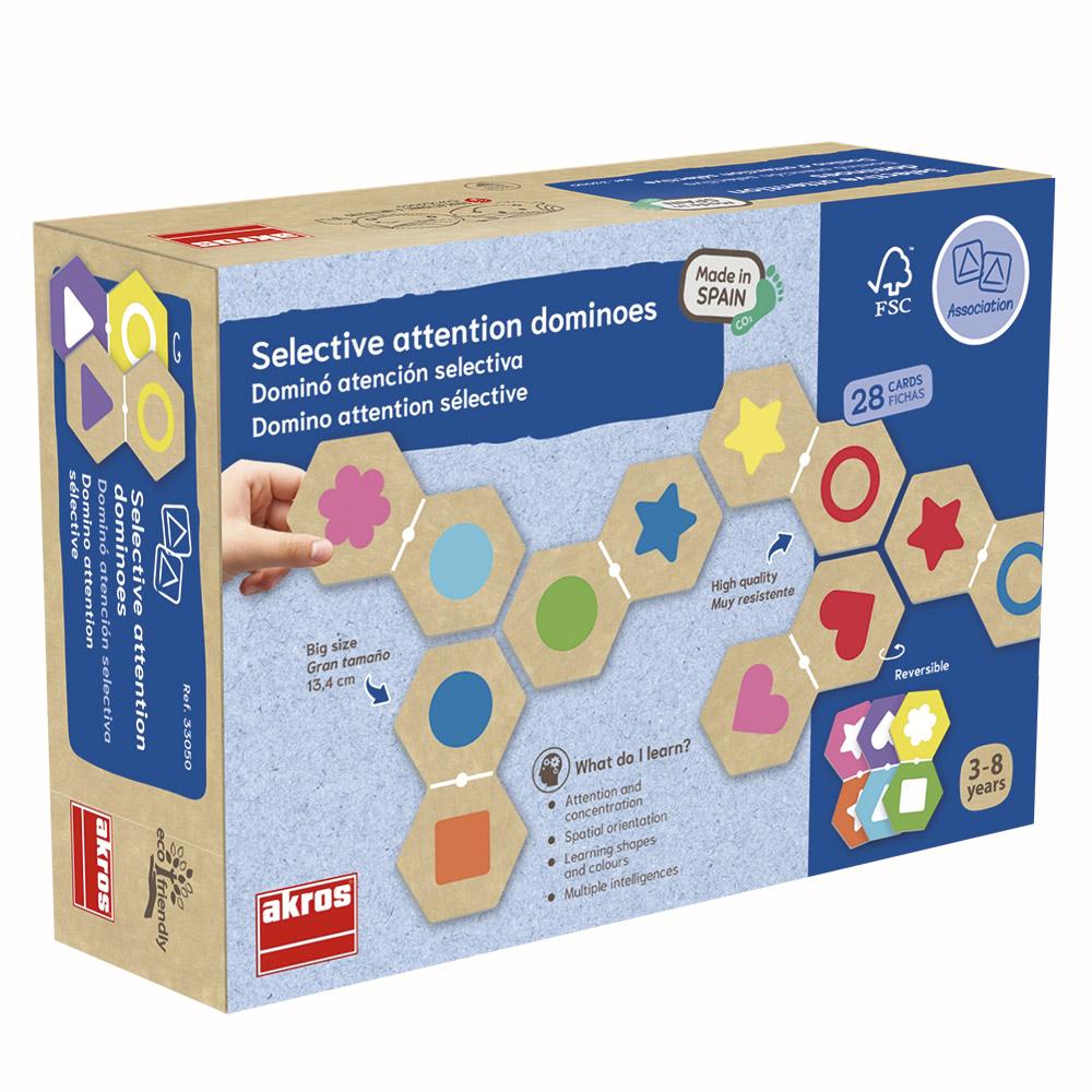 Este divertido dominó está especialmente diseñado apra trabajar la atención selectiva a través de la asociación de diferentes formas y colores. Niños y niñas dirigirán la atención a un atributo, la forma o el color, para realizar la asociación; de esa manera desarrollarán la atención, la concentración y la visión espacial de forma lúdica.
