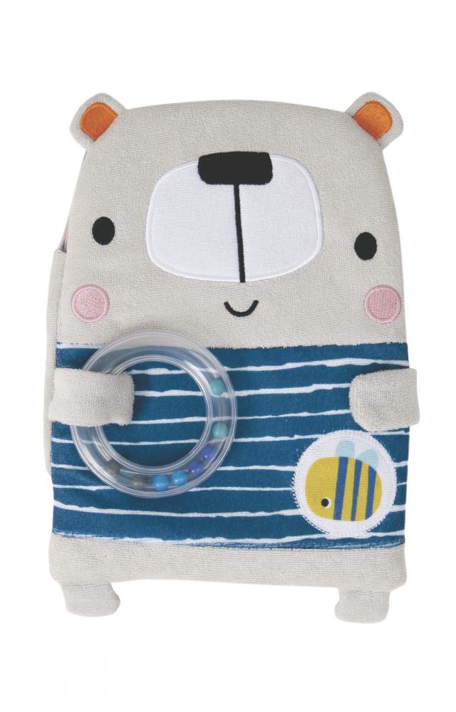 En este libro de cuentos, el osito y el conejito juegan con sus amigos antes de irse a dormir. Un libro de tela y un sonajero para que los bebés observen, toquen y jueguen. También pueden usarlo como peluche.