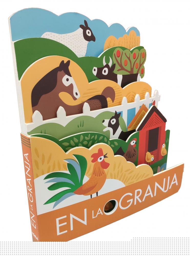 Libros interactivos de cartón troquelado y con pequeños relieves en cada página para estimular el sentido del tacto de los niños. En la granja tiene como protagonista a un gallo que se pasea por toda la granja para dar los buenos días al resto de animales.
