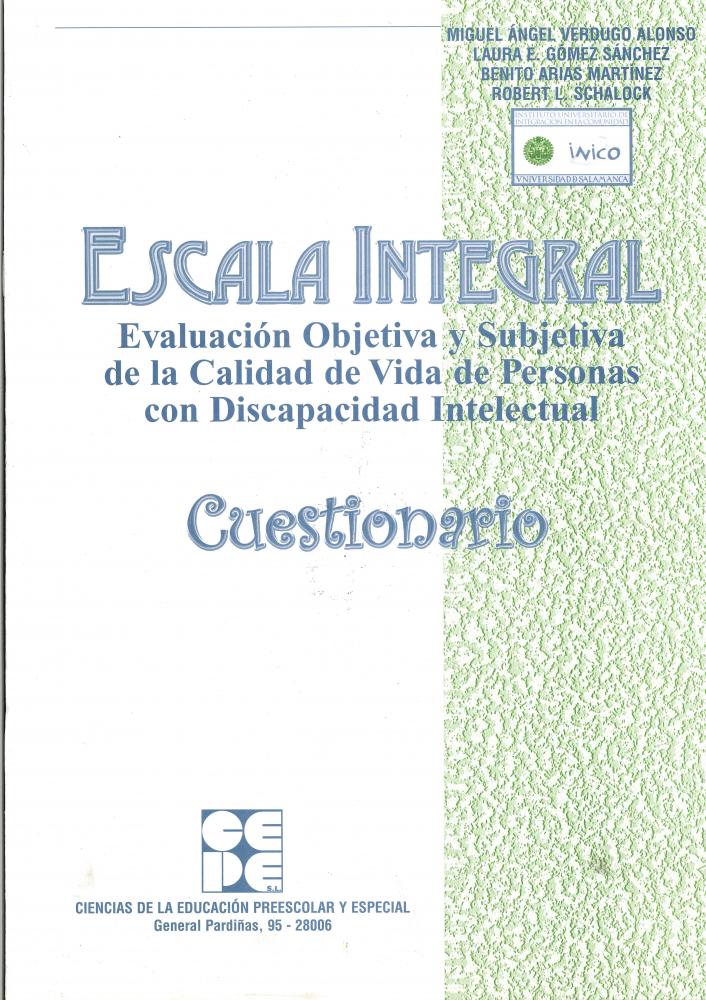 FICHA TÉCNICA ESCALA INTEGRAL Nombre: Escala Integral de Calidad de Vida. Subescalas: Escala Objetiva y Escala Subjetiva de Calidad de Vida. Autores: Miguel Ángel Verdugo Alonso, Laura E. Gómez Sánchez, Benito Arias Martínez y Robert L. Schalock. Significación: Evaluación multidimensional de la calidad de vida y estudio de la relación entre la evaluación objetiva y subjetiva de calidad de vida. Basada en el modelo multidimensional de Schalock y Verdugo (2002-2003). Ámbito de aplicación: Personas con discapacidad intelectual con habilidades de comprensión y expresión. Edad de aplicación: A partir de 18 años. Informadores: Profesionales de los servicios sociales que conozcan a la persona al menos desde hace tres meses. Validación: Instituto Universitario de Integración en la Comunidad (INICO). Universidad de Salamanca, España. Administración: Individual o colectiva. Ambas escalas son autoadministrables. Es posible la aplicación de una sola de las subescalas así como su aplicación conjunta. Duración: Forma completa: 27-40 min. Escala Objetiva: 7-10 min. Escala Subjetiva: 20-30 min. Significación: Escala Objetiva: evaluación objetiva de la calidad de vida (Autodeterminación, Bienestar emocional y físico, Bienestar material, Inclusión social y Bienestar Laboral). Escala Subjetiva: evaluación subjetiva de la calidad de vida (Autodeterminación, Bienestar emocional y físico, Bienestar material, Inclusión social, Bienestar Laboral y Bienestar Familiar). Finalidad: Identificar el perfil de calidad de vida objetiva y subjetiva de una persona para la realización de planes individualizados de apoyo, estudiar la relación o discrepancia entre ellas y proporcionar una medida fiable para la supervisión de los progresos y los resultados de los planes. Baremación: Puntuaciones estándar (M= 10; DT= 3) en las dimensiones de calidad de vida, percentiles e Índice de Calidad de vida.
