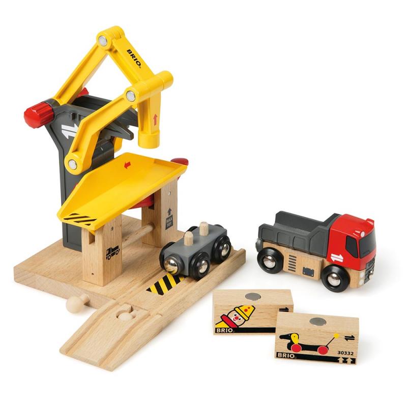 Esta genial estación de carga de mercancías es perfecta para que la añadas a tu colección de piezas Brio, podrás mover la mercancía del vagón al contenedor deslizándola con solo pulsar el botón, ¡está previsto que hoy llegue mucha mercancía que organizar!
