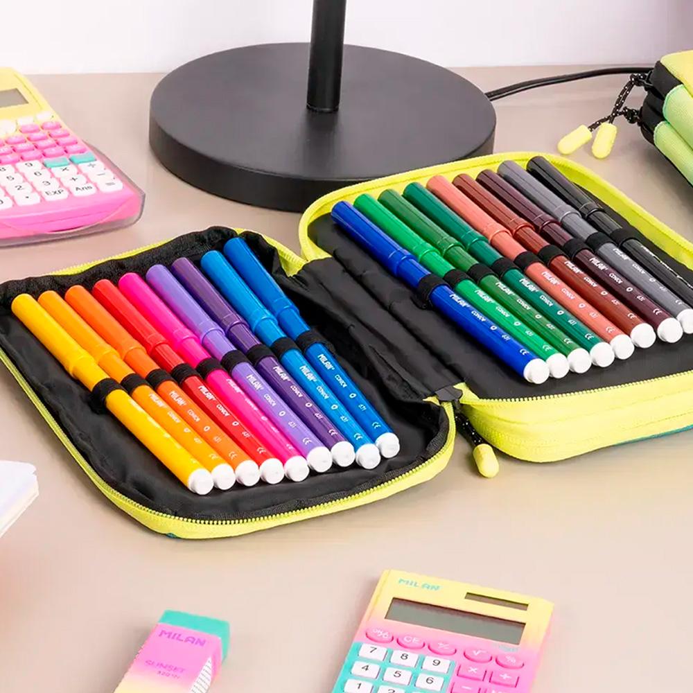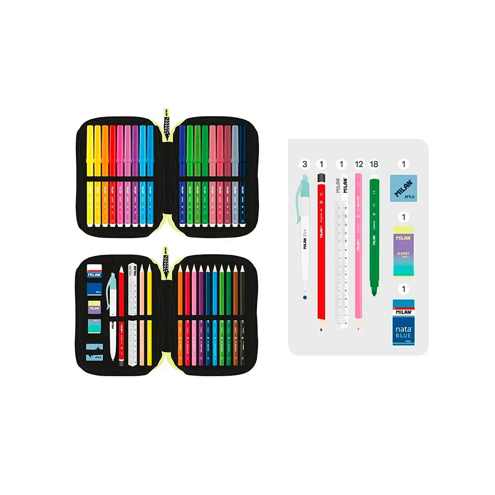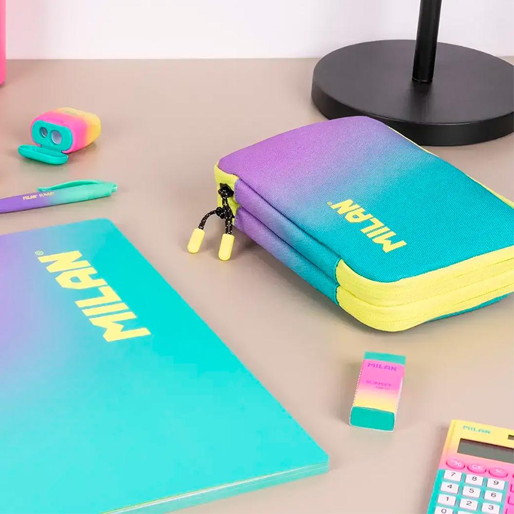 El estuche modelo Sunset dispone de dos pisos que permiten mantener el material escolar siempre ordenado y accesible. Contiene una amplia variedad de accesorios de gran calidad.
