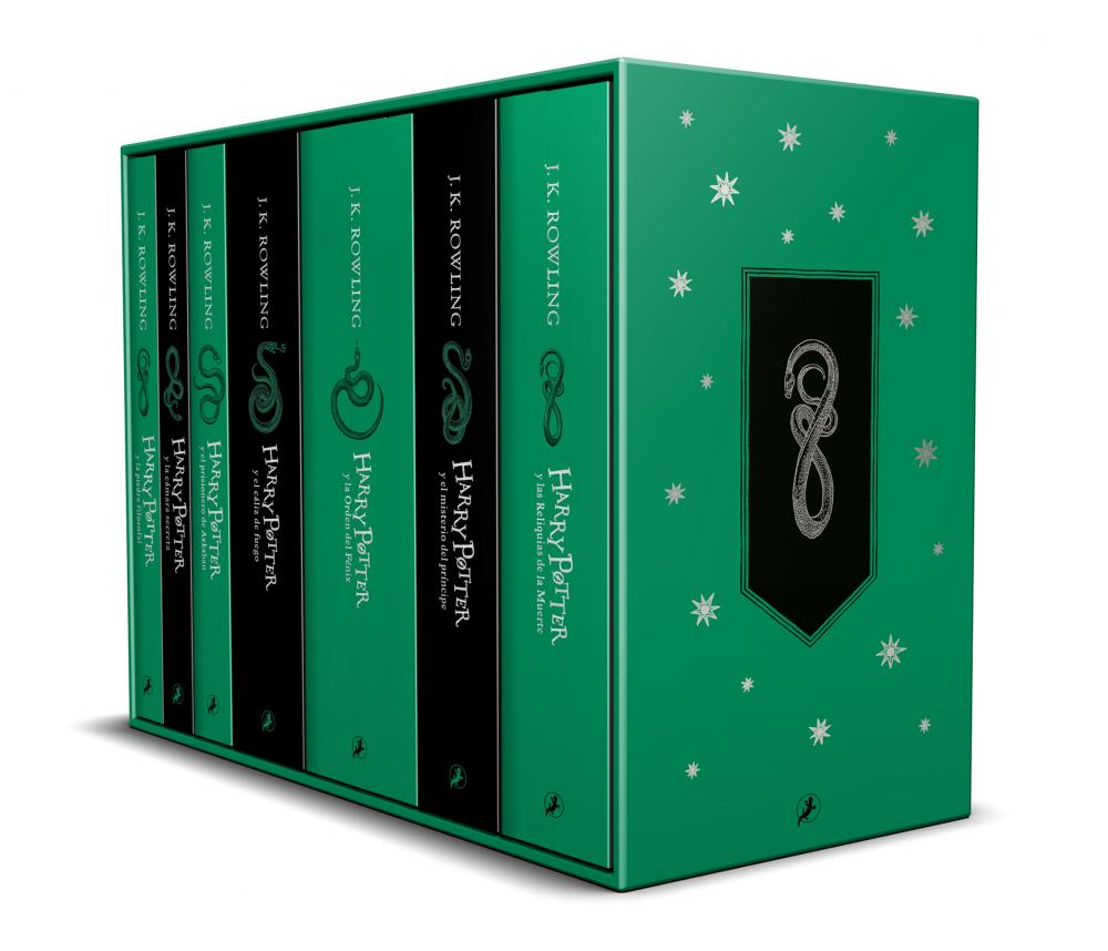 Estuche de la saga Harry Potter de la casa Slytherin, en una cuidada edición limitada con acabados de lujo y material inédito.