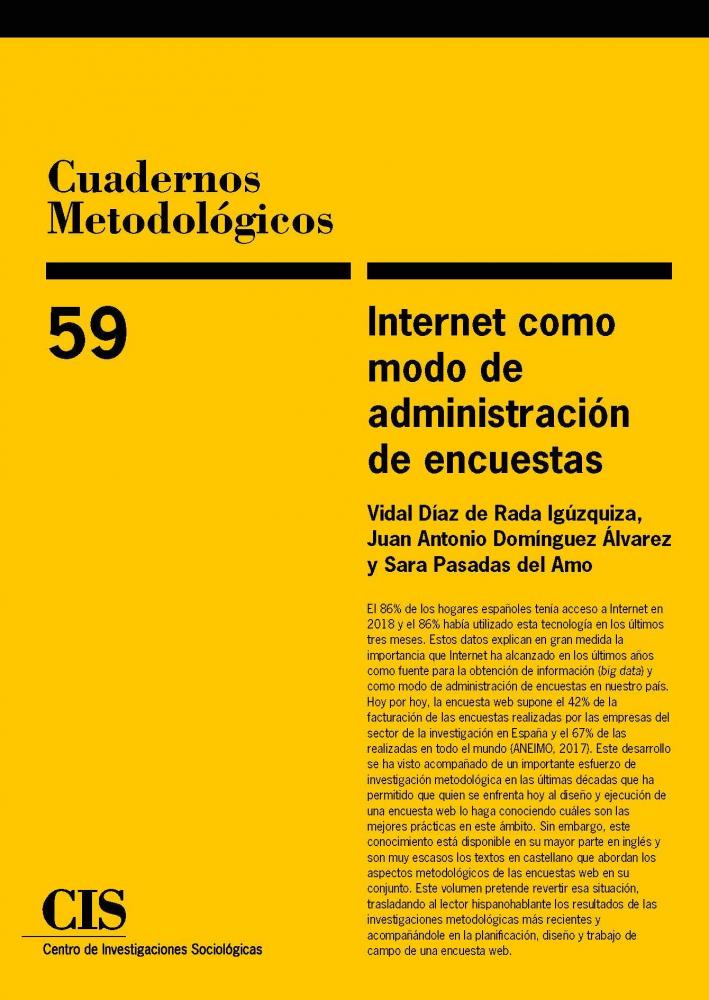 El 86% de los hogares españoles tenía acceso a Internet en 2018 y el 86% había utilizado esta tecnología en los últimos tres meses. Estos datos explican en gran medida la importancia que Internet ha alcanzado en los últimos años como fuente para la obtención de información (big data) y como modo de administración de encuestas en nuestro país. Hoy por hoy, la encuesta web supone el 42% de la facturación de las encuestas realizadas por las empresas del sector de la investigación en España y el 67% de las realizadas en todo el mundo (ANEIMO, 2017). Este desarrollo se ha visto acompañado de un importante esfuerzo de investigación metodológica en las últimas décadas que ha permitido que quien se enfrenta hoy al diseño y ejecución de una encuesta web lo haga conociendo cuáles son las mejores prácticas en este ámbito. Sin embargo, este conocimiento está disponible en su mayor parte en inglés y son muy escasos los textos en castellano que abordan los aspectos metodológicos de las encuestas web en su conjunto. Este volumen pretende revertir esa situación, trasladando al lector hispanohablante los resultados de las investigaciones metodológicas más recientes y acompañándole en la planificación, diseño y trabajo de campo de una encuesta web.