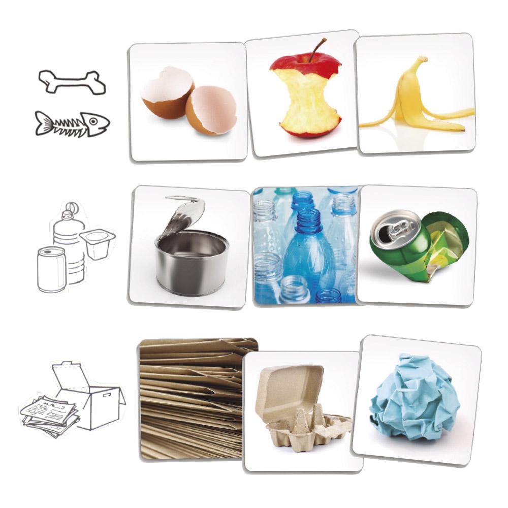 • Contiene: 5 minicontenedores, 22 pictogramas adhesivos, 35 fichas residuos y 1 maxi-dado.