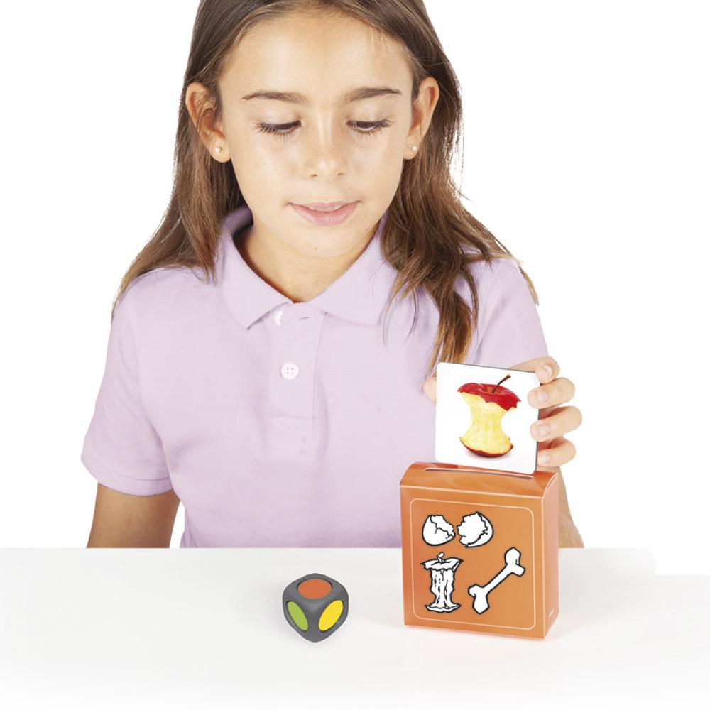 Contiene: 5 minicontenedores, 22 pictogramas adhesivos, 35 fichas residuos y 1 maxi-dado.