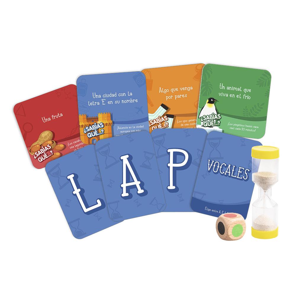 • Contiene 120 cartas de categoría, 1 reloj de arena, 1 dado de madera, 100 cartas de letra y reglas del juego.