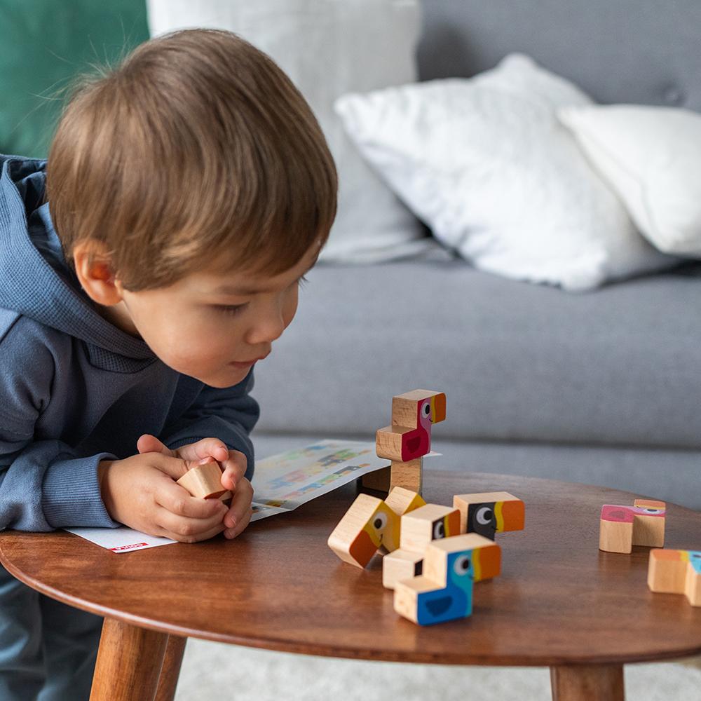 El juego incluye 7 ejemplos de cómo se pueden apilar y servirán de ejemplo a los pequeños grandes constructores de la casa, ¡un rompecabezas ideal para primeras edades!