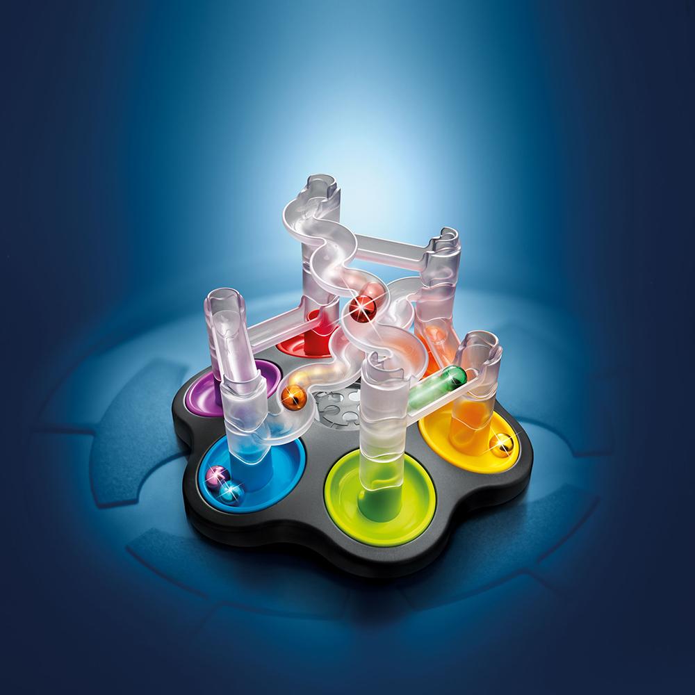 • 1 tablero de juego con seis bases, 6 canicas, 2 espaciadores, 5 rampas cortas, 2 rampas largas, 1 tarjeta de desafíos.