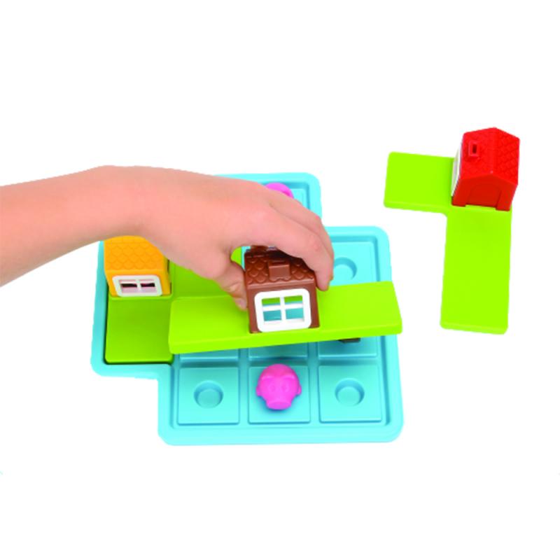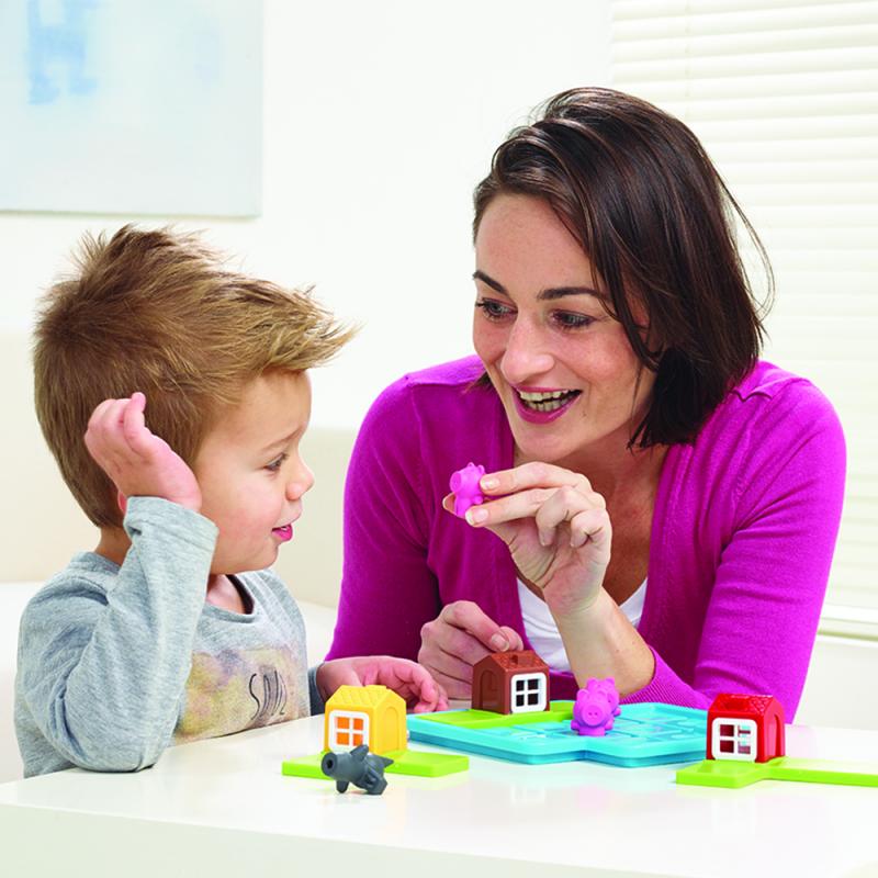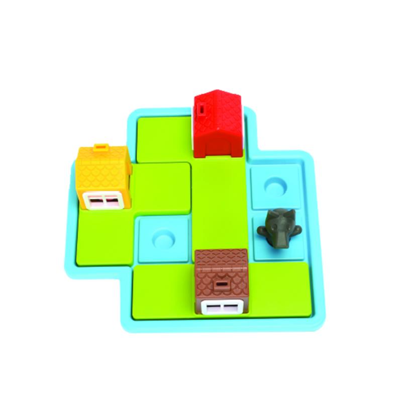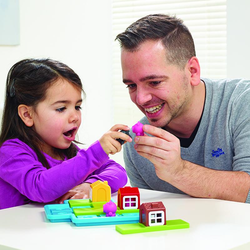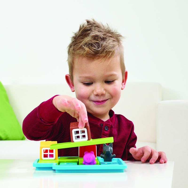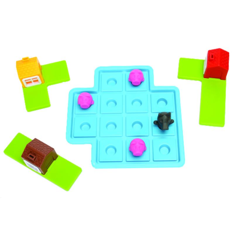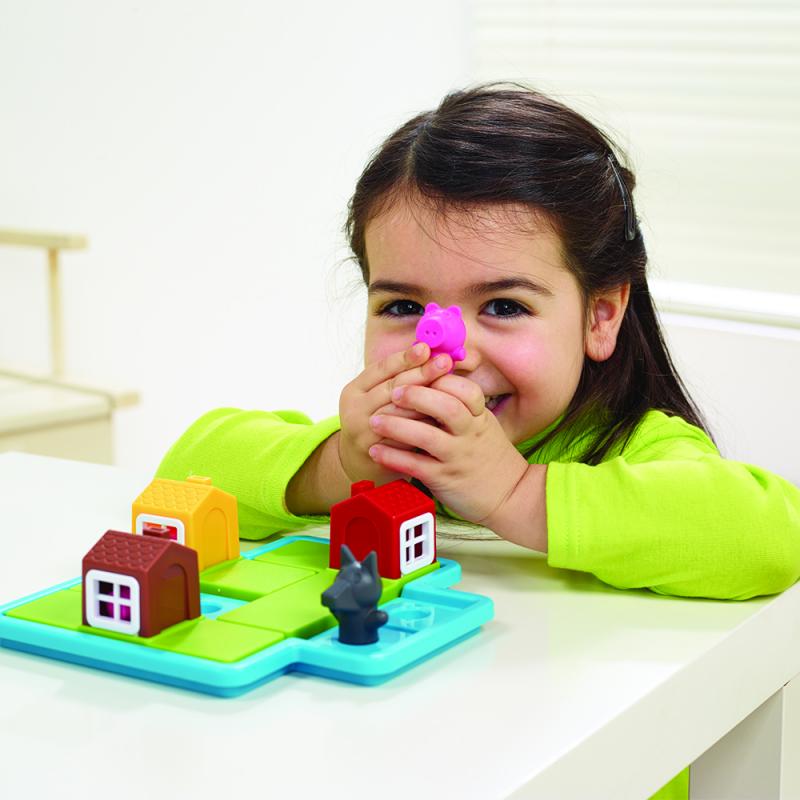 Los Tres Cerditos es un juego de ingenio perfecto para iniciarse en los juegos de lógica, ya que dispone de pocas piezas grandes y fáciles de manipular. Los niños y niñas quedarán fascinados con las figuras de los cerditos y el lobo, al ver cómo los cerditos entran en las casas y se asoman a las ventanas. Los retos disponen de distintos niveles de dificultad que aumentan progresivamente, facilitando el desarrollo del pensamiento lógico a la vez que los más pequeños afianzan sus habilidades manuales y de resolución de problemas.