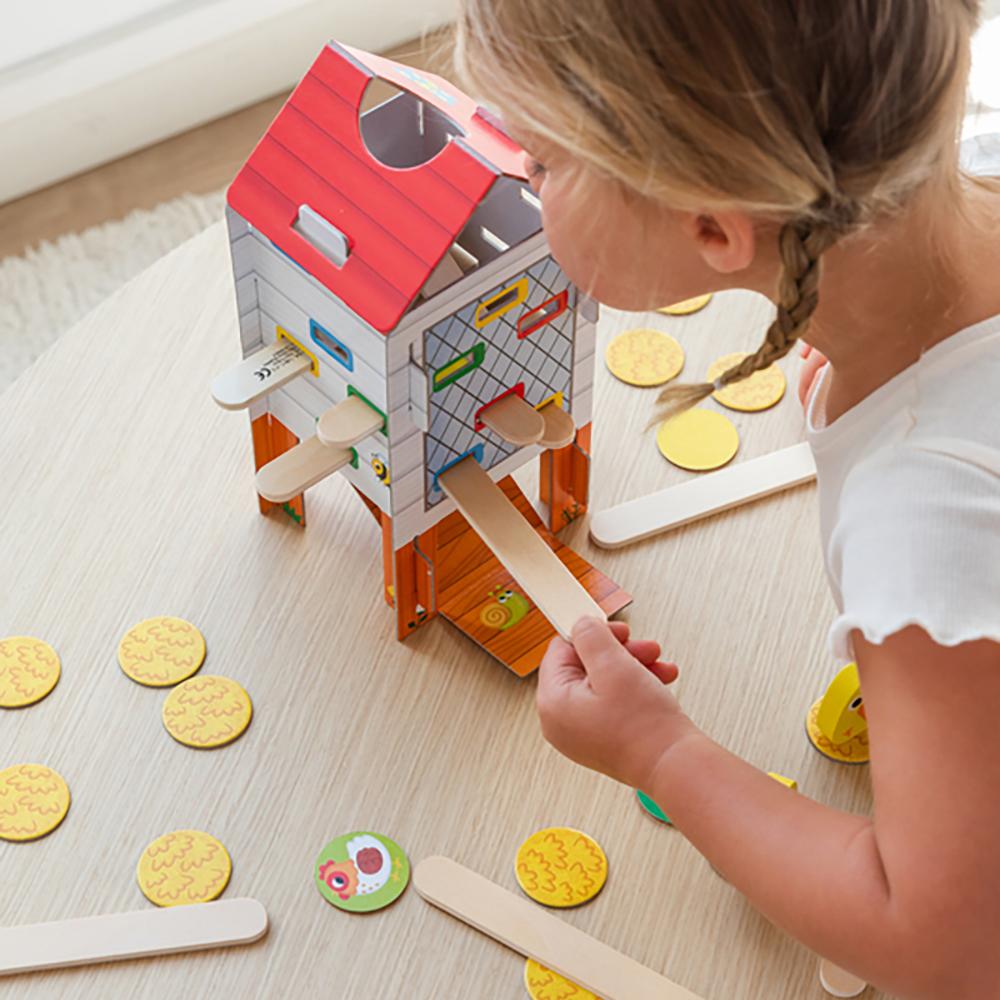 Es un juego competitivo en el que los niños deben retirar palitos del gallinero con mucho cuidado para rescatar a los pollitos sin que se caigan. ¿Te atreves a sacar el máximo número de pollitos? Además, incluye una variante de juego donde el reto es conseguir el mayor número de palos sin que el pollito se deslice. ¡Dos formas de jugar, doble diversión!