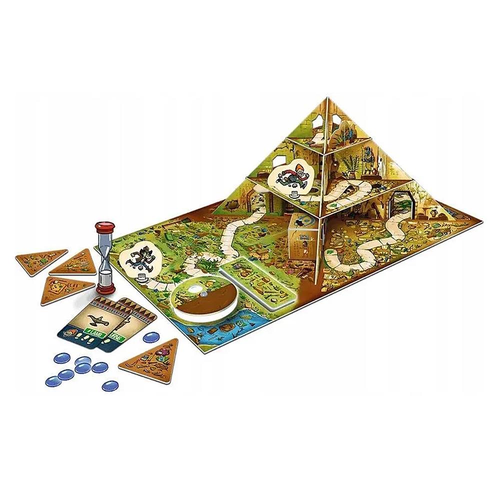 • Contiene tablero Piramidal 3D, 10 fichas de marcador, 56 cartas de pistas, 6 fichas de pirámides, 2 personajes, reloj de arena e instrucciones.