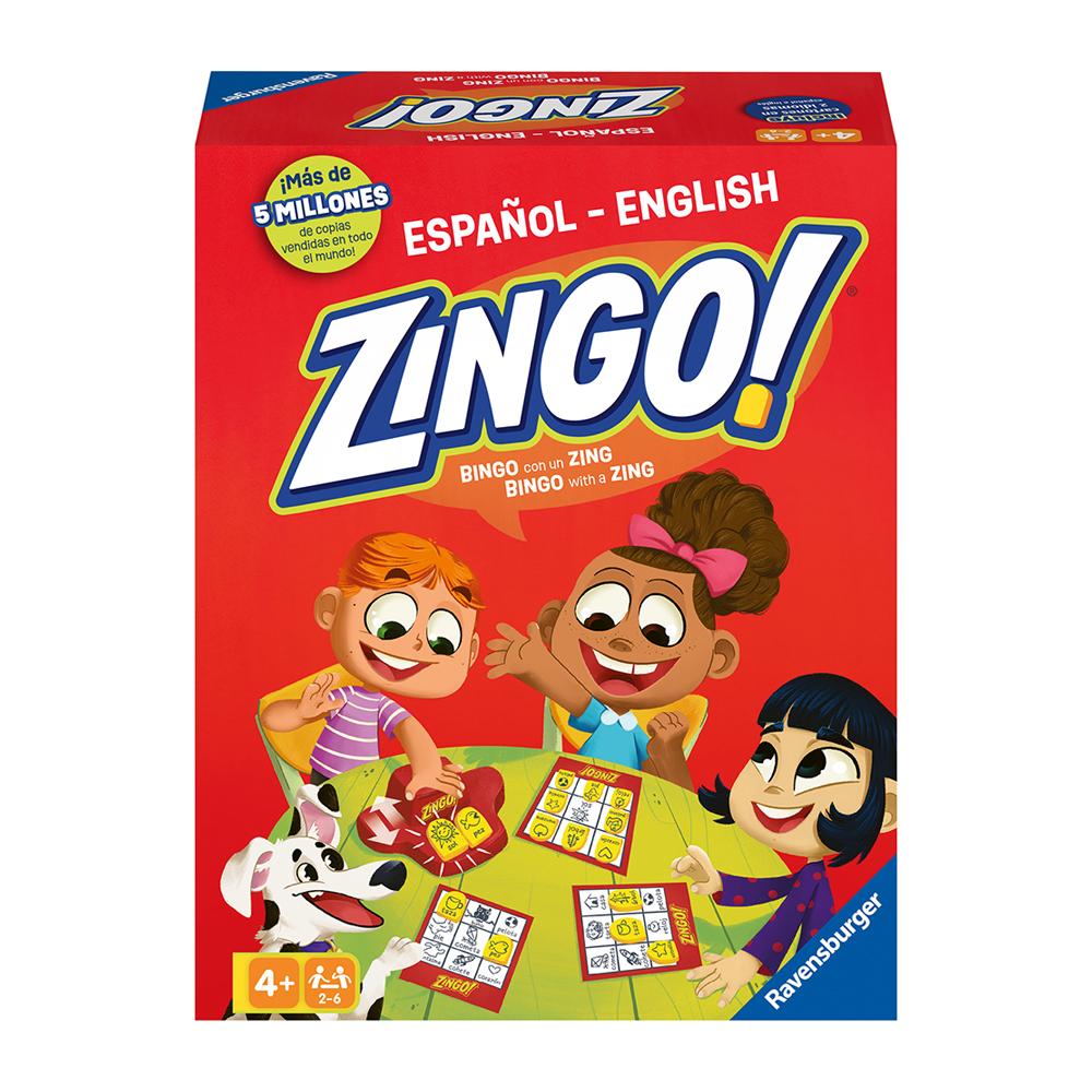 • Contiene: 6 tarjetas Zingo de doble cara español inglés y dos niveles de juego; 72 fichas con imágenes en ambas caras; 1 repartidor Zingo; una guía de juego y una guía para padres.