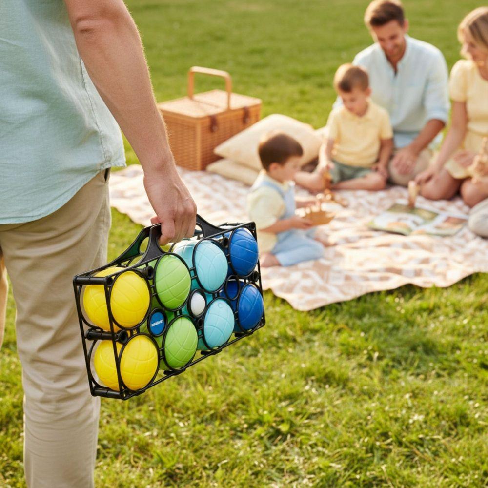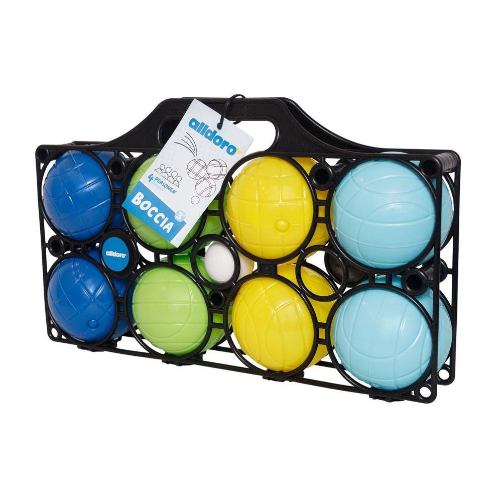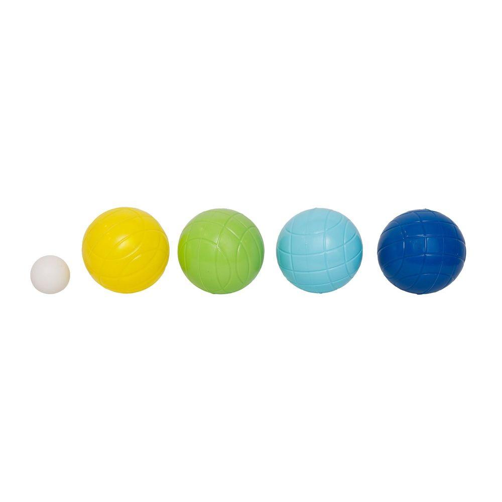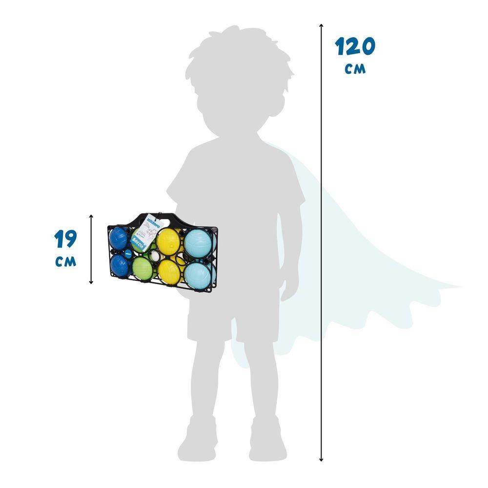 Contiene 8 bolas de colores, 1 bola objetivo blanca y soporte con asa para transportarlas.