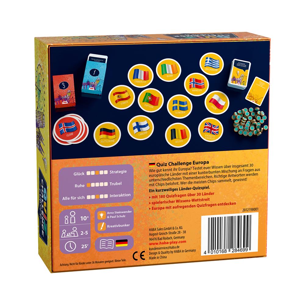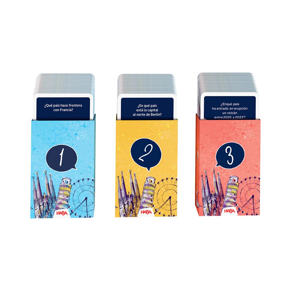 Contiene 180 tarjetas de preguntas y respuestas (en 3 juegos de 60 tarjetas cada uno), 21 tarjetas de países, 50 fichas e instrucciones.