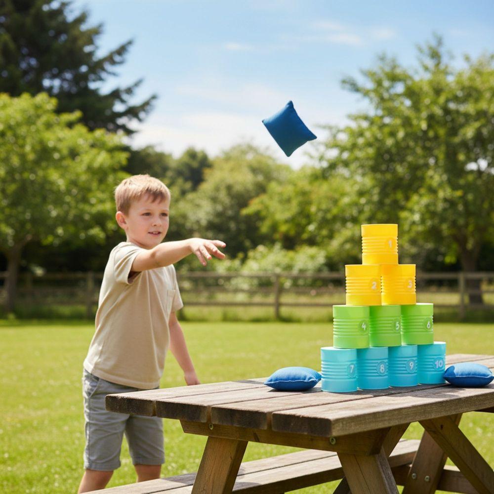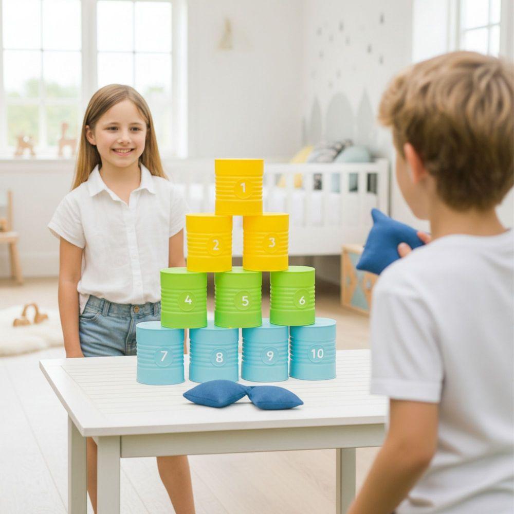 Este juego de tiro al bote es más que diversión: ayuda a los niños y niñas a desarrollar la coordinación mano-ojo, a practicar el conteo y las sumas al acumular puntos, y aprender a esperar turno y colaborar con sus compañeros. Además, fomenta la estrategia y la resolución de problemas al planificar lanzamientos para superar retos y alcanzar la mejor puntuación.