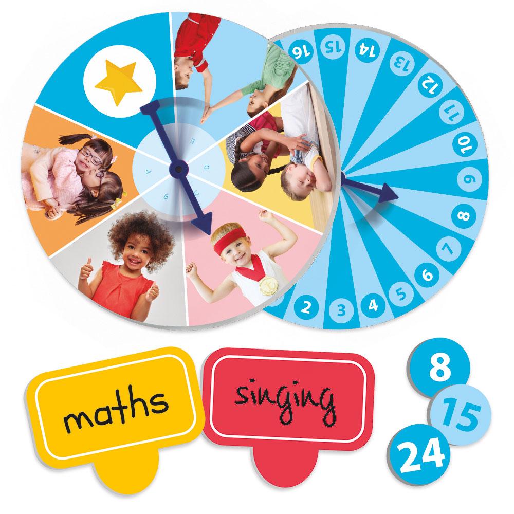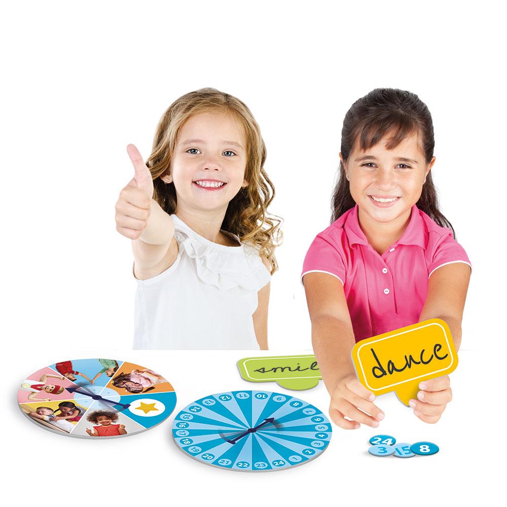 • El juego contiene: 3 ruletas de cartón resistente (18 cm), 24 bocadillos reescribibles de cartón resistente (10 x 8 cm), 24 fichas circulares de cartón resistente (3 cm) y 12 rotuladores borrables.