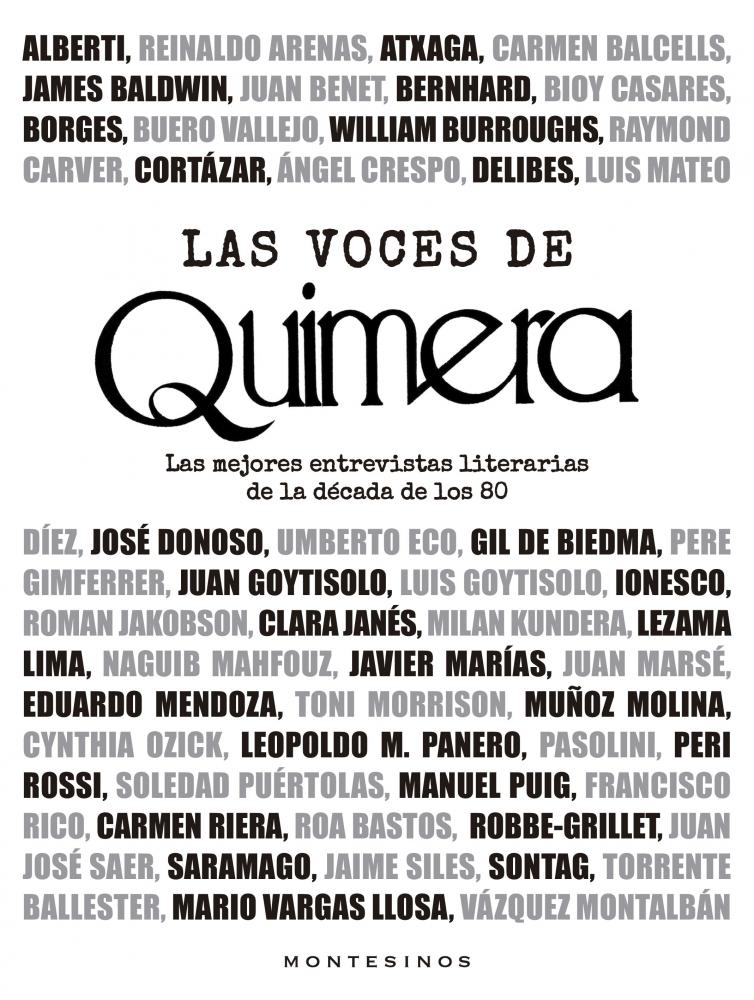 Desde su nacimiento en noviembre de 1980, la revista Quimera ha sido un referente en el mundo literario en lengua española y, mes tras mes, sigue en la vanguardia de la crítica literaria. En sus páginas han tomado la palabra los más destacados escritores y pensadores en entrevistas donde no solo se han adentrado en su obra sino también en su lado más humano. Antonio Buero Vallejo, Toni Morrison, Rafael Alberti, Eugène Ionesco, Carmen Balcells, Thomas Bernhard, Reinaldo Arenas, James Baldwin, Susan Sontag, Julio Cortázar, Umberto Eco, Jaime Gil de Biedma, William Burroughs, Ángel Crespo, Jorge Luis Borges, Raymond Carver y muchas otras grandes figuras literarias fueron entrevistadas en la revista dejando testimonio de su voz, lecciones irrepetibles de literatura, miedos y pasiones ante la creación y la vida. Con esta edición, recogemos las más destacadas aparecidas en sus páginas entre 1980 y 1989. Juntas suponen, además, el compendio de toda una época. Incluye una entrevista a modo de prólogo con Miguel Riera, editor de la revista durante la década de los 80. El listado completo de los entrevistados: Rafael Alberti, Reinaldo Arenas, Bernardo Atxaga, Carmen Balcells, James Baldwin, Juan Benet, Thomas Bernhard, Adolfo Bioy Casares, Jorge Luis Borges, Antonio Buero Vallejo, William Burroughs, Raymond Carver, Julio Cortázar, Ángel Crespo, Miguel Delibes, Luis Mateo Díez, José Donoso, Umberto Eco, Jaime Gil de Biedma, Pere Gimferrer, Luis Goytisolo, Juan Goytisolo, Eugène Ionesco, Roman Jakobson, Clara Janés, Milan Kundera, José Lezama Lima, Naguib Mahfouz, Javier Marías, Juan Marsé, Eduardo Mendoza, Toni Morrison, Antonio Muñoz Molina, Cynthia Ozick, Leopoldo María Panero, Pier Paolo Pasolini, Cristina Peri Rossi, Soledad Puértolas, Manuel Puig, Francisco Rico, Carmen Riera, Augusto Roa Bastos, Alain Robbe-Grillet, Juan José Saer, José Saramago, Jaime Siles, Susan Sontag, Gonzalo Torrente Ballester, Mario Llosa, Manuel Vázquez Montalbán.