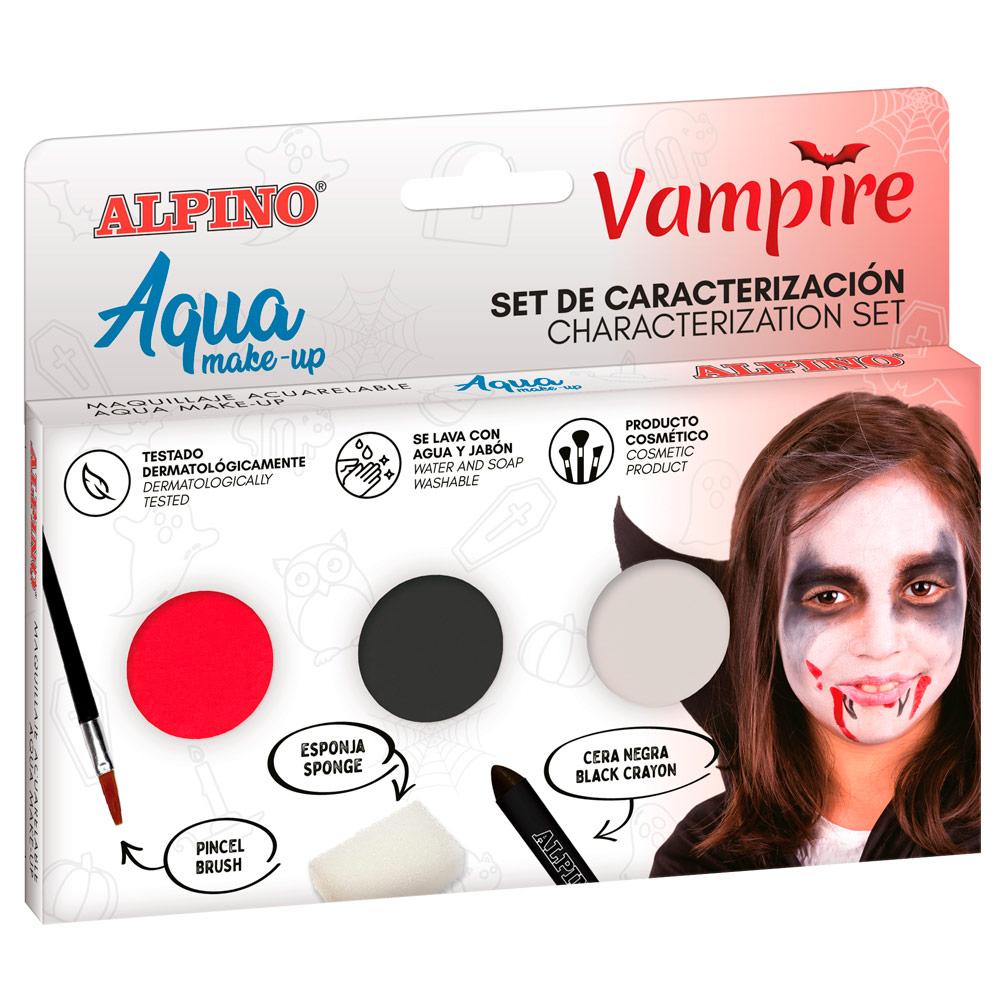 Contiene maquillaje en godet rojo, negro y blanco, cera negra, esponja y pincel.