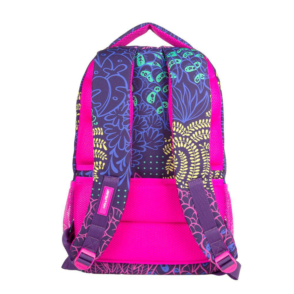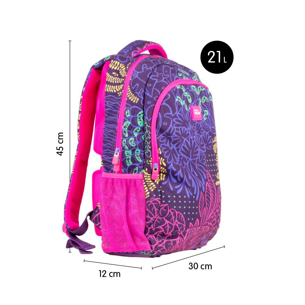 El diseño de esta mochila esta inspirado en el entorno donde viven las luciérnagas, creado por diferentes formas de vegetación y hojas, estampados en colores lila, fucsia, amarillo y verde, sobre base lila oscura. Está fabricado en su totalidad con resistente poliéster.