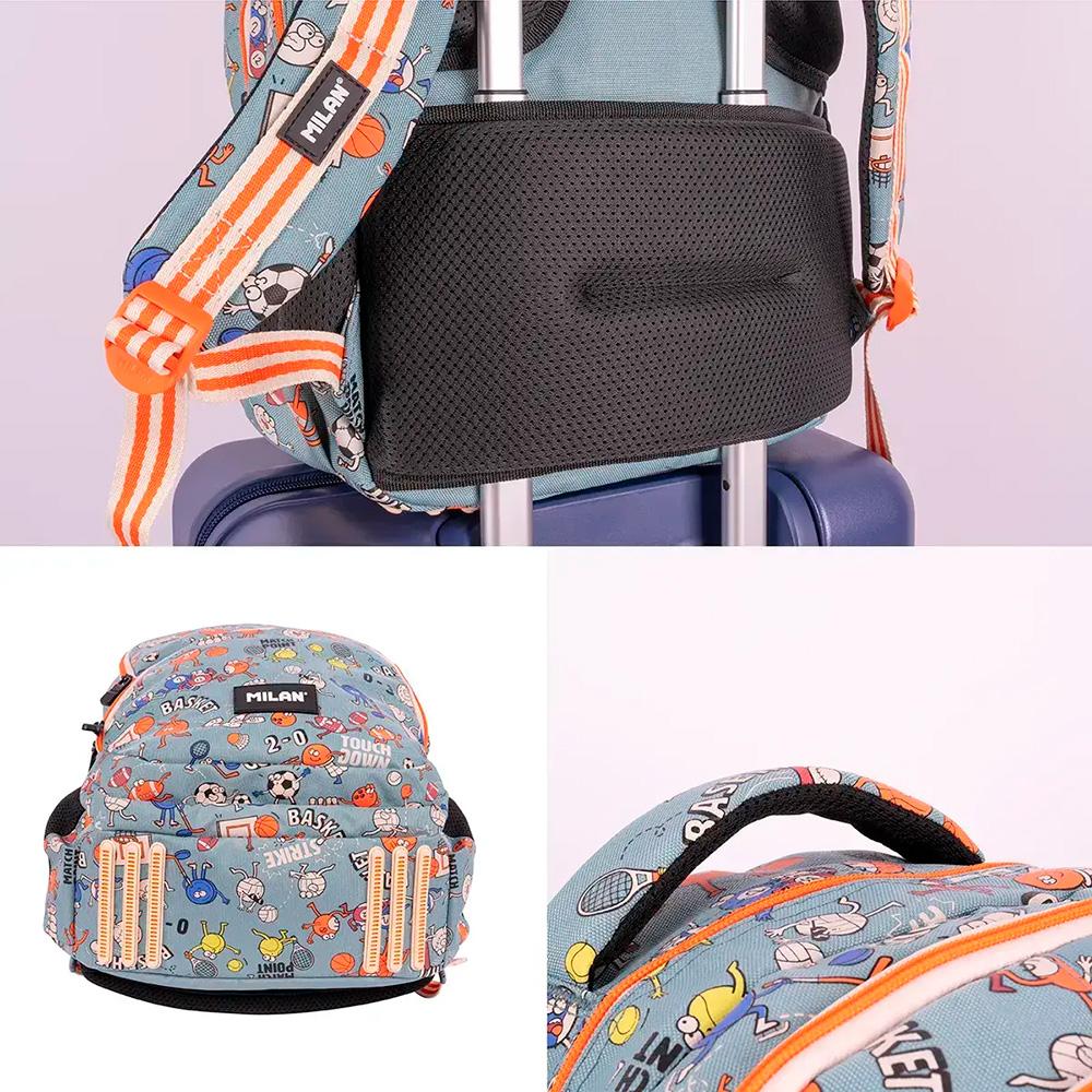 Dispone de un bolsillo principal con compartimento interior protector para portátil, 3 bolsillos delanteros y 2 bolsillos laterales de malla de fácil acceso. La espalda y los tirantes cuentan con refuerzo acolchado y son transpirables. Incluye refuerzo en la  base y es apta para carrito porta mochilas.