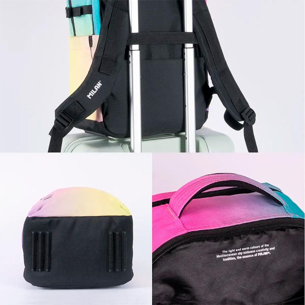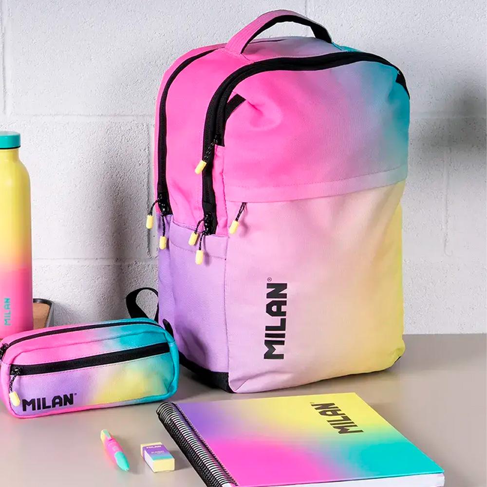 Mochila modelo Sunset lila en tonos degradados, ideal para llevar el material escolar de la forma más cómoda y organizada.