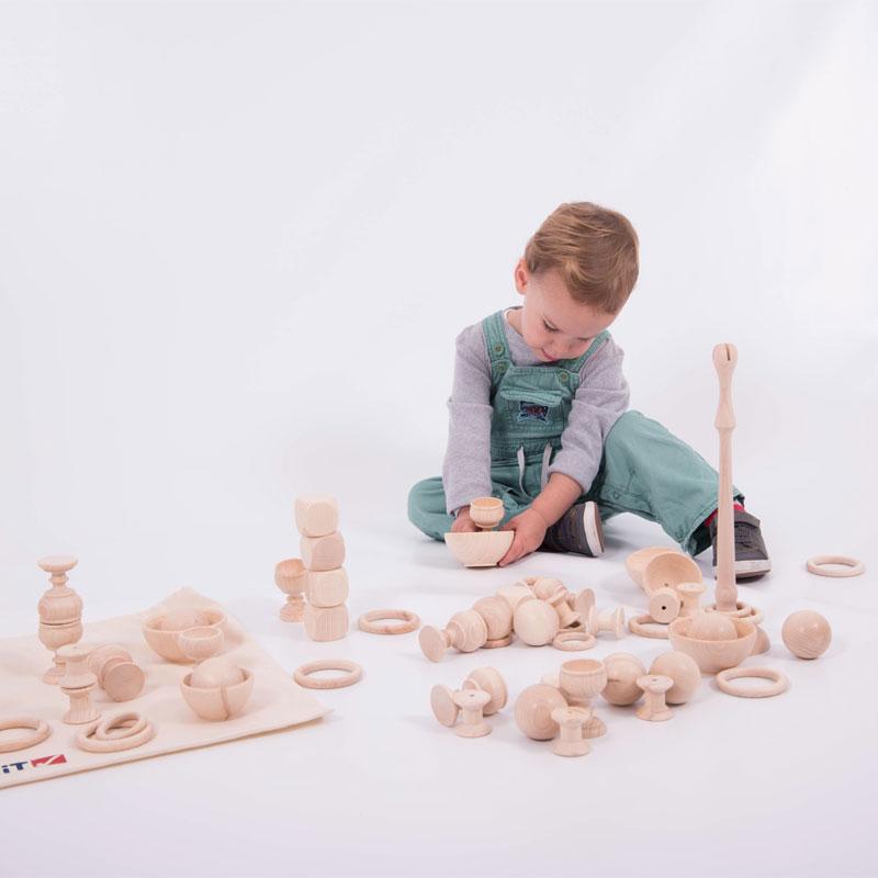 Este kit de iniciación está formado por 63 piezas de madera natural e incluye una bolsa de algodón para guardar las piezas y guía orientativa de uso.