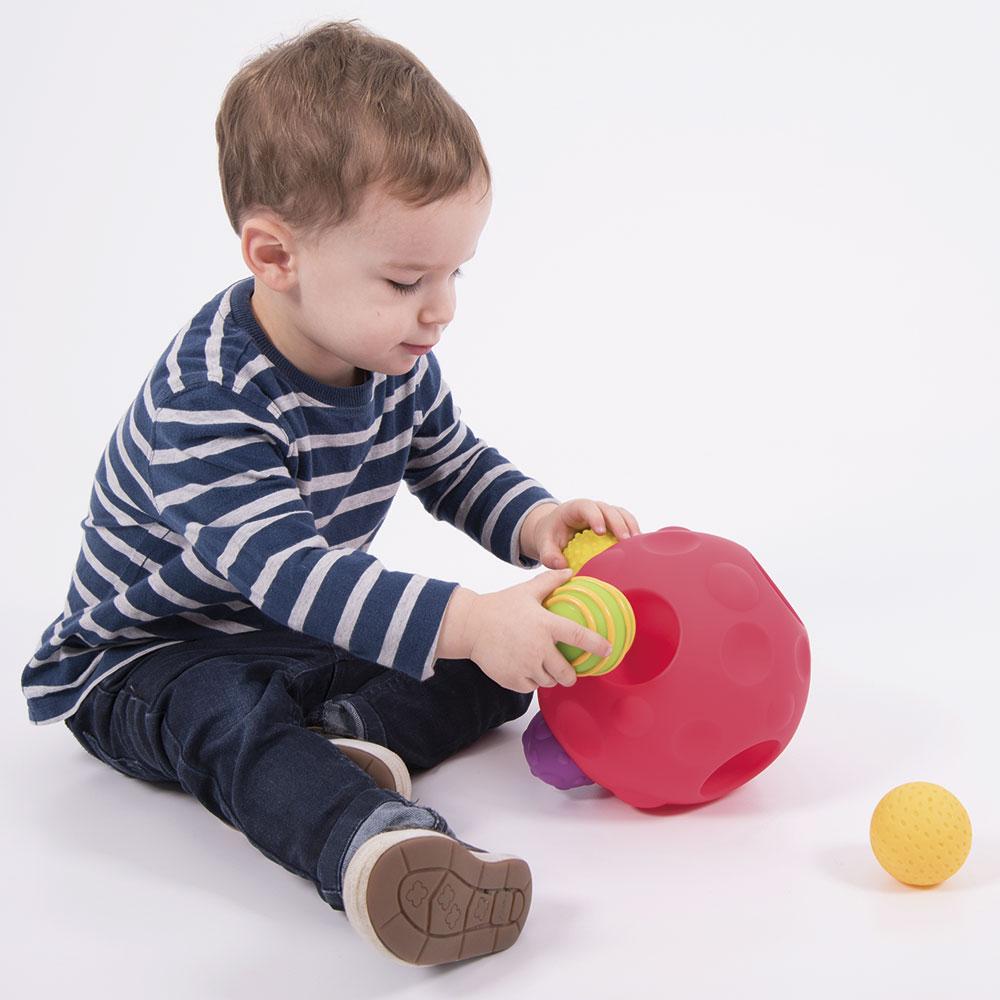 Contiene una gran bola con 6 pelotas más pequeñas de diferentes colores, texturas y tamaños.