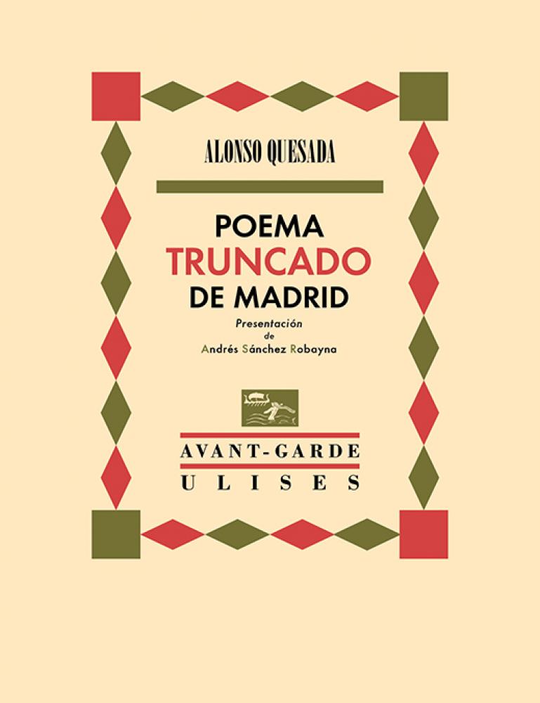 Publicado en cuatro entregas entre los meses de octubre y noviembre de 1920 en el semanario España, el Poema truncado de Madrid (Entrevisión de un insulario) de Alonso Quesada es una de las piezas más genuinas y logradas de la literatura española de avanzada. Como anota Andrés Sánchez Robayna: «El significado último del poema nos lo sugiere, en parte, su subtítulo: es la entrevisión de un insulario, el tejido roto o discontinuo de la visión de la gran ciudad por parte de ?un corazón atlántico?. Seducción y frenesí, alegría y vivacidad no impiden al poeta advertir la caótica epidermis del mundo capitalino, de un mundo de superficies, de una ciudad, en definitiva, hueca o vacía. Por la personalísima calidad de la visión, por su escritura tensa y ágil y, en fin, por su insólito prosaísmo apasionado, el Poema truncado de Madrid es tanto uno de los textos más sugestivos de la poesía española postmodernista como una de las primeras y más atrayentes expresiones de la literatura hispánica de las vanguardias». A pesar de su importancia y originalidad, hasta hoy no había sido publicado nunca en edición exenta.  Alonso Quesada (Las Palmas de Gran Canaria, 1886-1925) es una figura mayor del postmodernismo español. Junto a los poetas Tomás Morales y Saulo Torón compone la terna canaria que inicia la poesía moderna canaria, a pesar de la brevedad de su obra, compuesta por un solo libro de poemas publicado mientras vivió, El lino de los sueños, un poema dramático, La Umbría, y una colección de crónicas periodísticas. Póstumamente se editaría un importante libro de poemas, Los caminos dispersos, y uno de relatos, Smoking Room, entre otros. Sobre él escribió Miguel de Unamuno: «Alonso Quesada ha tenido niñez. Acaso no ha tenido mucho más. La melancolía misma, la seriedad, la madurez, son de niño. Y su ironía, su malicia, ¿no tienen, acaso, también, un dejo de deliciosa frescura infantil?». En 1924 fue uno de los autores españoles seleccionados por Antonio Marichalar para el número dedicado a la joven literatura española por la revista francesa Intentions. En el Diccionario de las vanguardias en España, Juan Manuel Bonet anota: «Poeta postmodernista, uno de los principales de nuestra escena, en los últimos años evolucionó hacia la vanguardia como lo demuestra su excepcional Poema truncado de Madrid». Andres Sanchez Robayna (Las Palmas de Gran Canaria, 1952) es autor de una muy personal obra poética recopilada por la editorial Galaxia Gutenberg en el volumen En el cuerpo del mundo, al que cabe añadir tanto los tres volúmenes de sus diarios como sus ensayos Jorge Oramas o el tiempo suspendido, Borrador de la vela y de la llama y Variaciones sobre el vaso de agua. Dirigió la revista Syntaxis así como el Taller de Traducción Literaria de la universidad de La Laguna. Su último libro publicado es una colección de fragmentos titulado Las ruinas y la rosa (2024). Se le concedió el Premio Nacional de Traducción en 1982 y el Premio de la Crítica en 1984, así como el Prix Mallarmé en 2022. Hizo su tesis doctoral sobre Alonso Quesada: publicada en 1977, volverá a imprimirse en edición corregida y aumentada el año próximo por las ediciones de la Universidad de Barcelona. También fue responsable de la antología de Alonso Quesada que Plaza & Janés incluyó en 1981 en sus «Selecciones de Poesía Española».