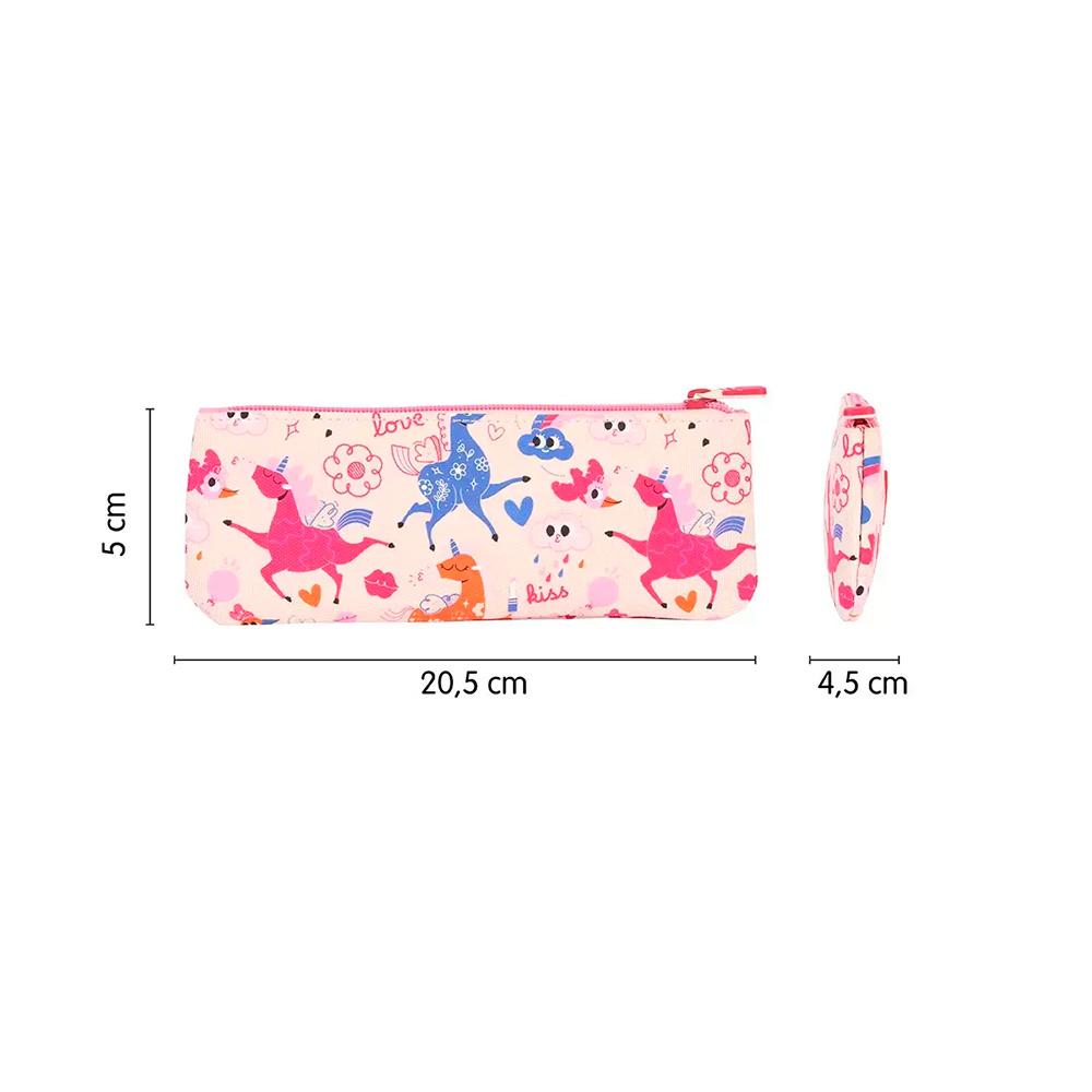 Estuche portatodo modelo Flowicorn con estampado de unicornios y diseño pequeño y plano, ideal para llevar los útiles de escritura imprescindibles ocupando el mínimo espacio.