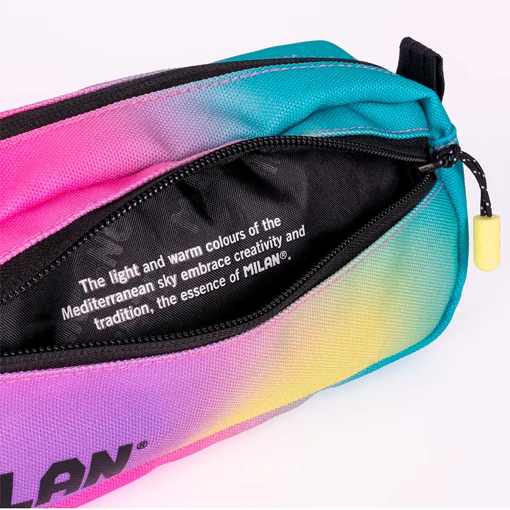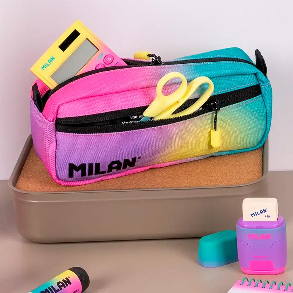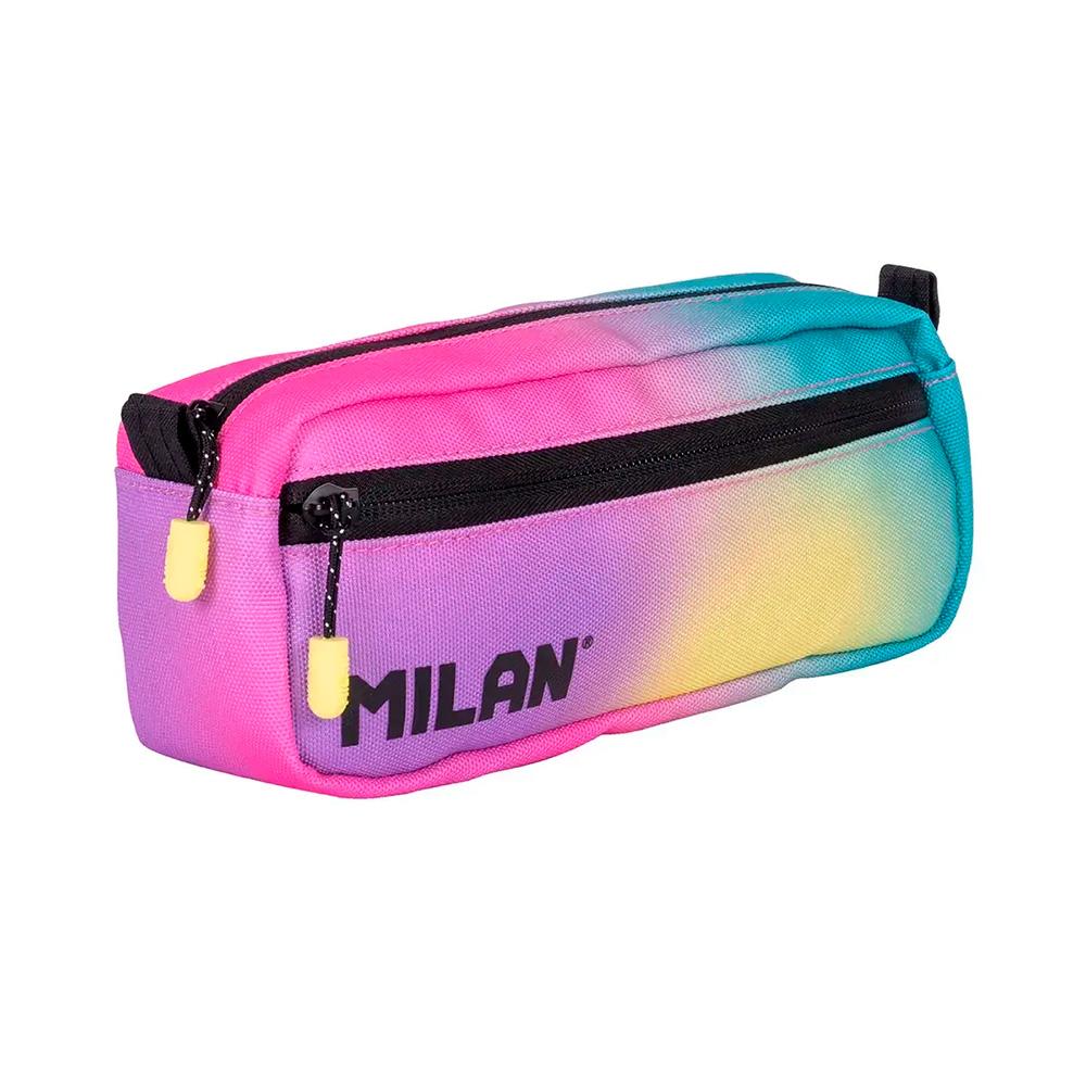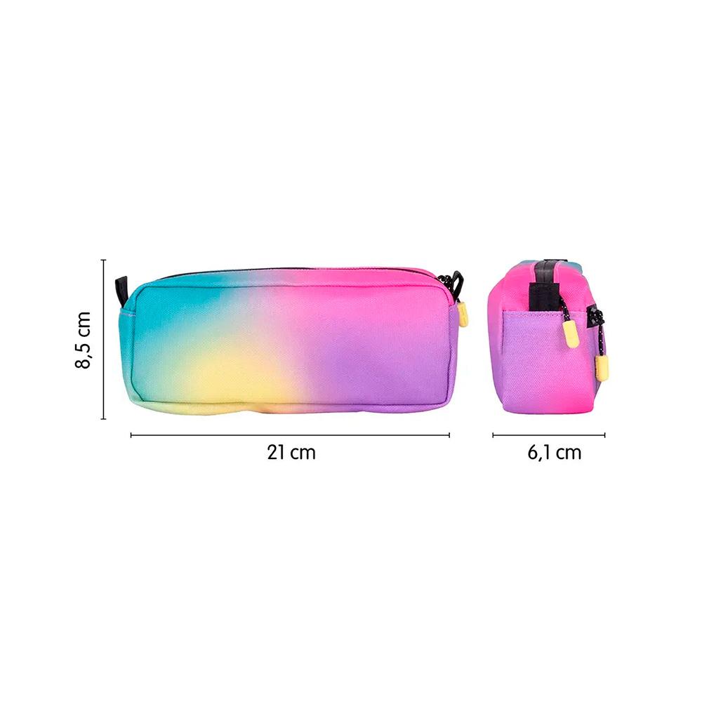 Estuche portatodo modelo Sunset con diseño rectangular y dos cremalleras, ideal para los útiles de escritura y otros accesorios escolares. Incluye un pequeño bolsillo frontal y un gran compartimento principal.