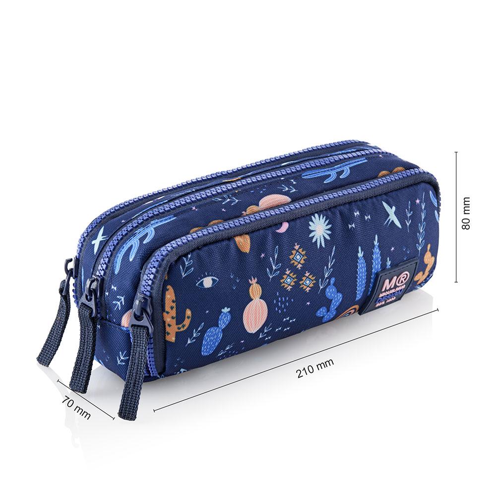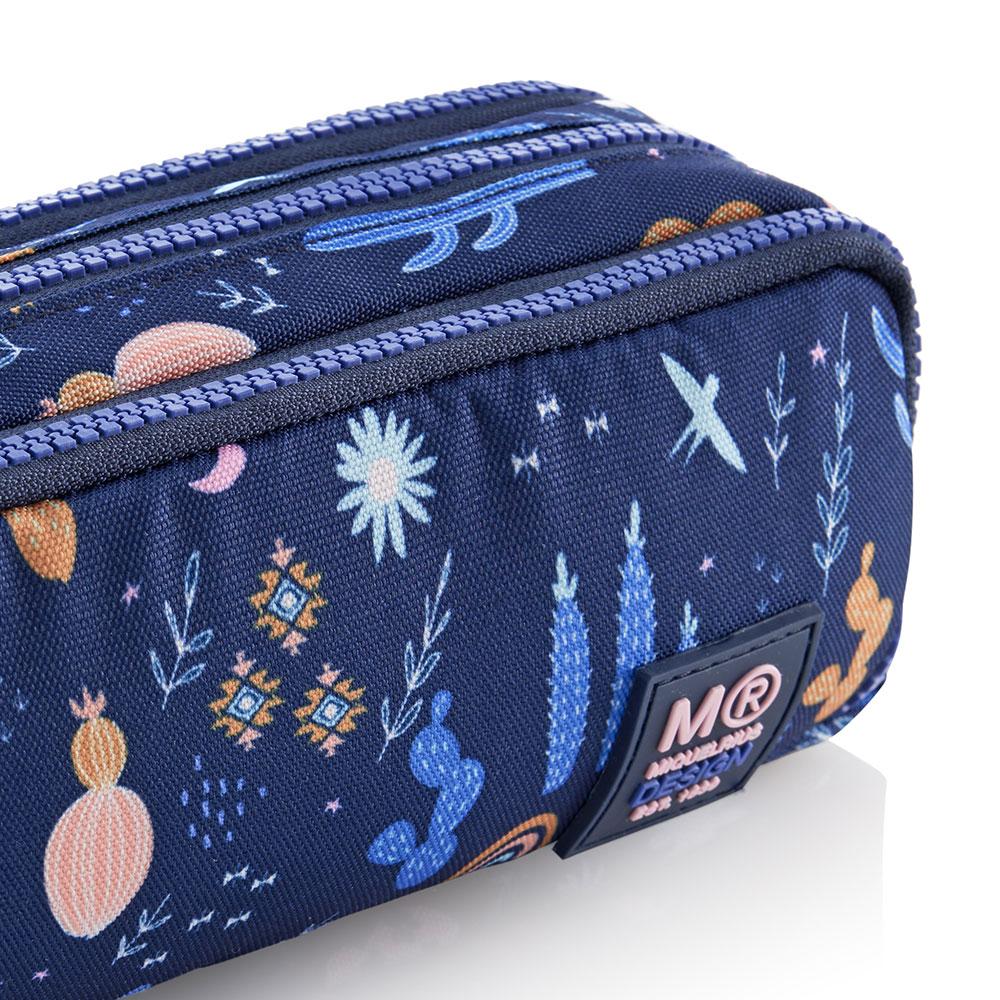 Estuche modelo Desert, de forma rectángular, con diseño fantasía sobre fondo azul marino.  Con tres cremalleras para tener mucho más espacio para guardar todas tus pinturas, fabricado en poliéster reciclado (RPET) y altamente resistente. Dispone de amplia capacidad, y su diseño permite que ocupe poco espacio. Adecuado para almacenar y transportar los materiales de escritura y estudio básicos.