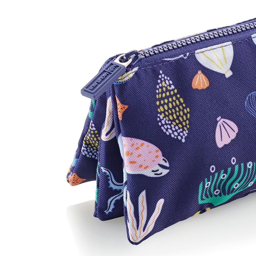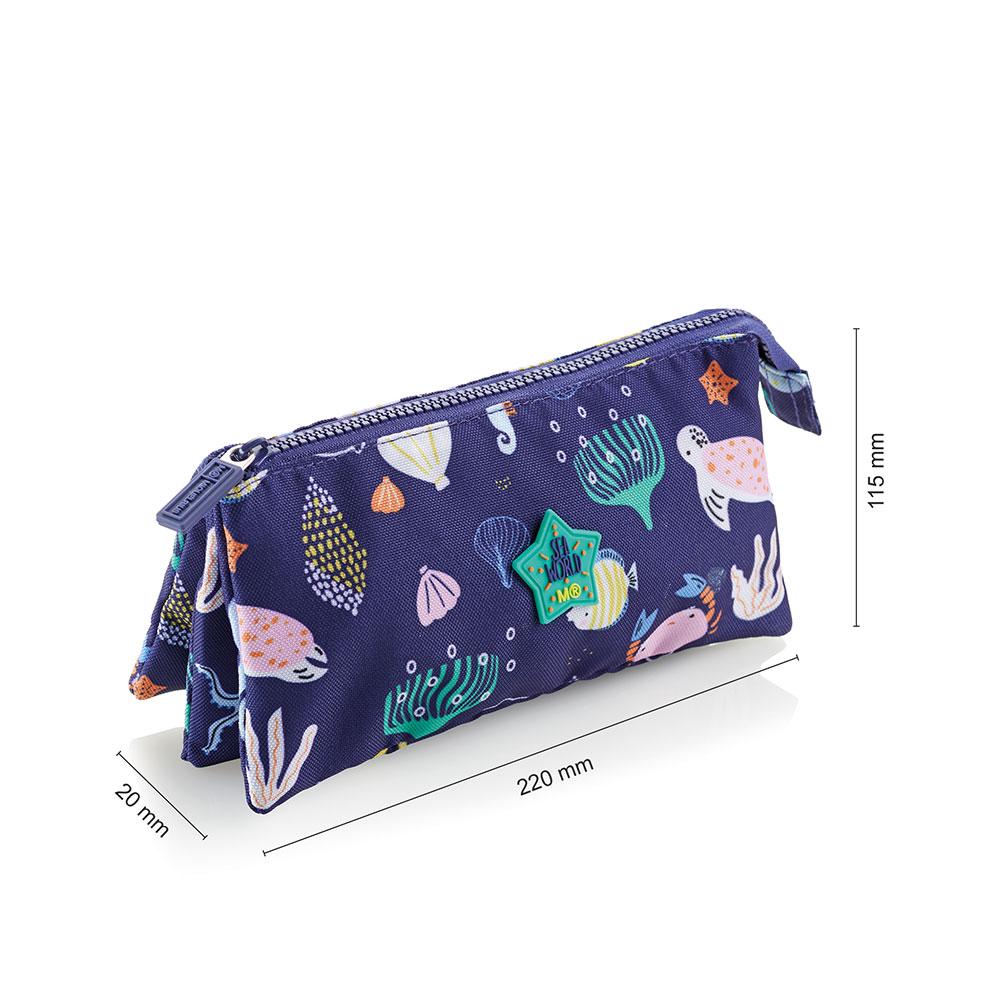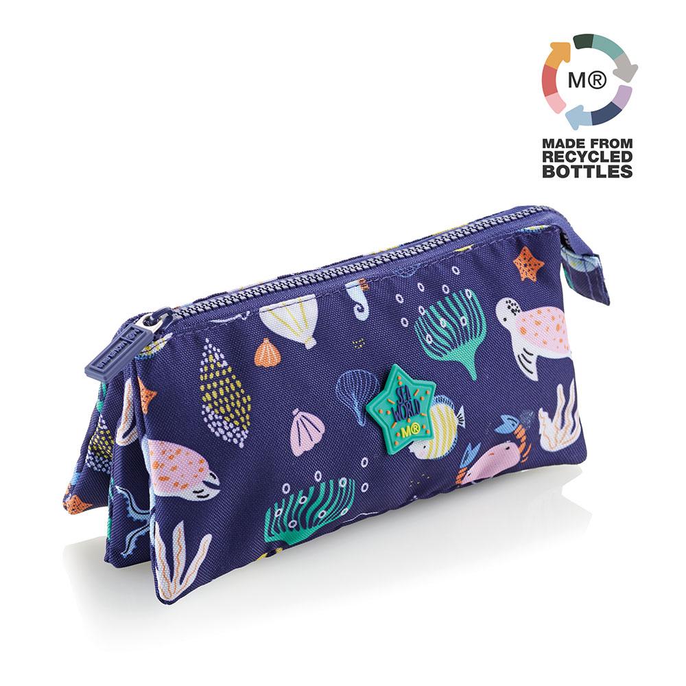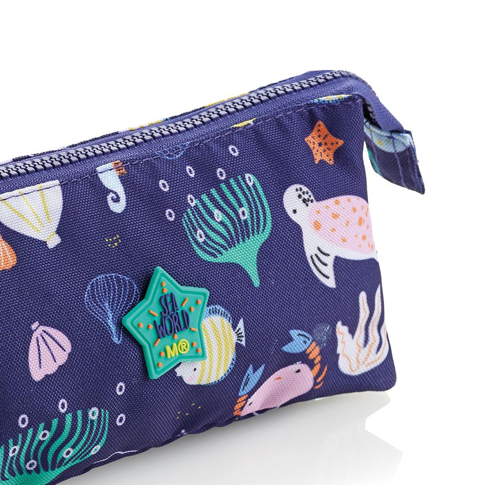 Estuche portatodo modelo Sea World, con diseño mundo marino sobre fondo azul oscuro. Con una cremallera y tres compartimentos diferenciados para tener mucho más espacio para guardar todas tus pinturas, fabricado en poliéster reciclado y altamente resistente. Dispone de amplia capacidad, y su diseño permite que ocupe poco espacio. Adecuado para almacenar y transportar los materiales de escritura y estudio básicos.