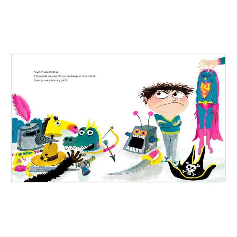 Hoy es la fiesta de Carnaval en el colegio y Kevin quiere disfrazarse de princesa, con su vestido, sus tacones y su maquillaje. Uno se disfraza para que no lo econozcan, y si no, no sirve de nada. Y si las chicas pueden disfrazarse de caballero, ¿por qué no va a ir él de princesa? Hoy Kevin es una princesa. Y punto. Kevin nos demuestra que a veces los estereotipos están para romperlos.