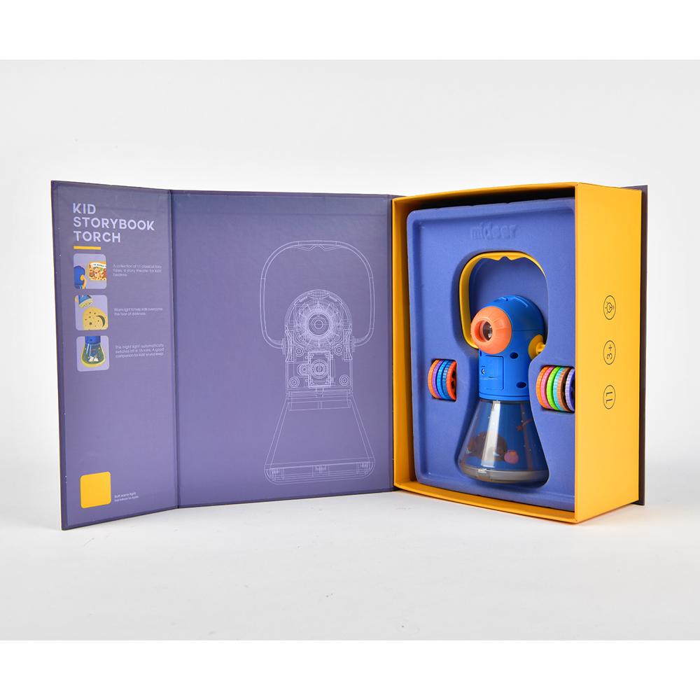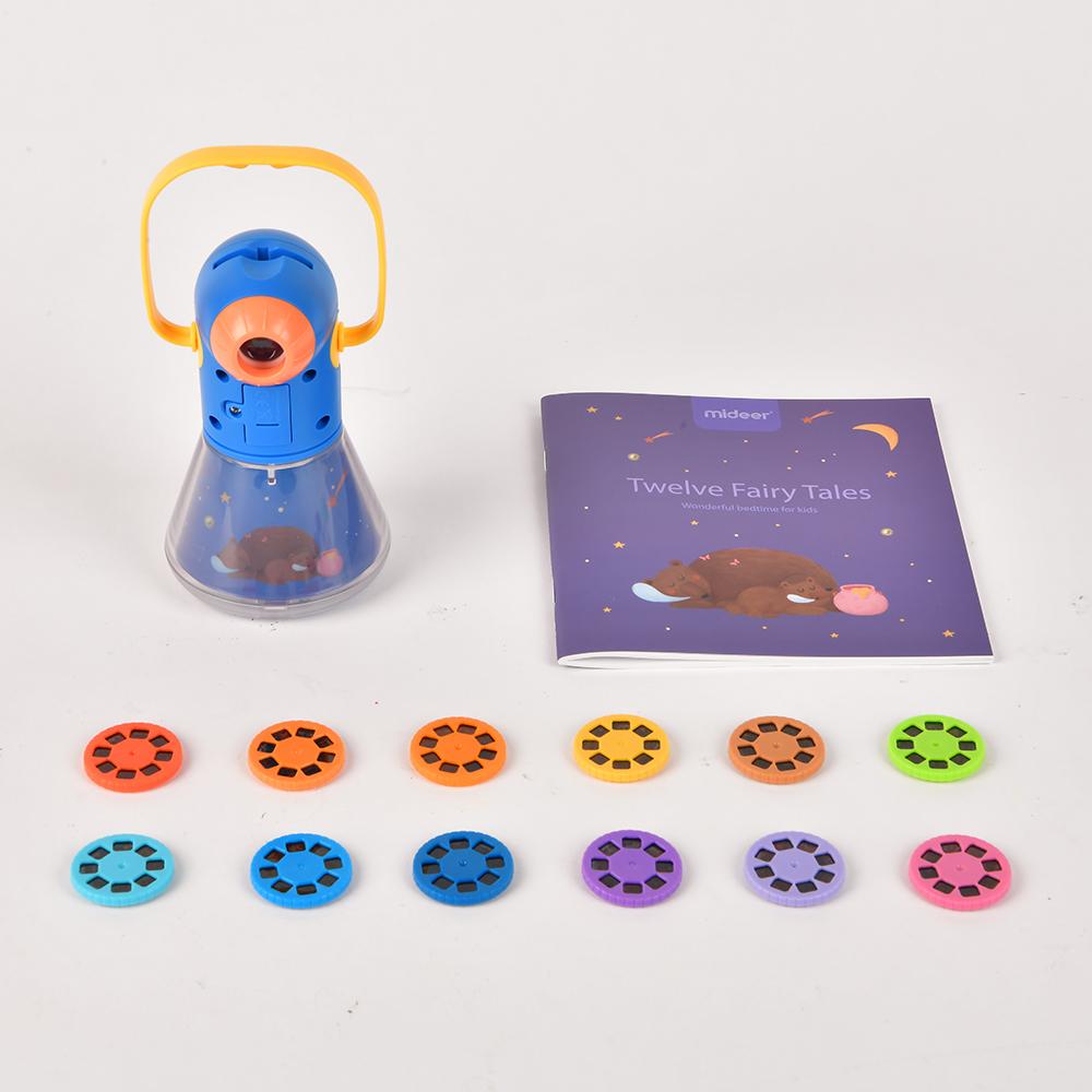 Contiene proyector de 7,5 x 15,50cm., libro de cuentos y 12 discos con cuentos para proyectar.