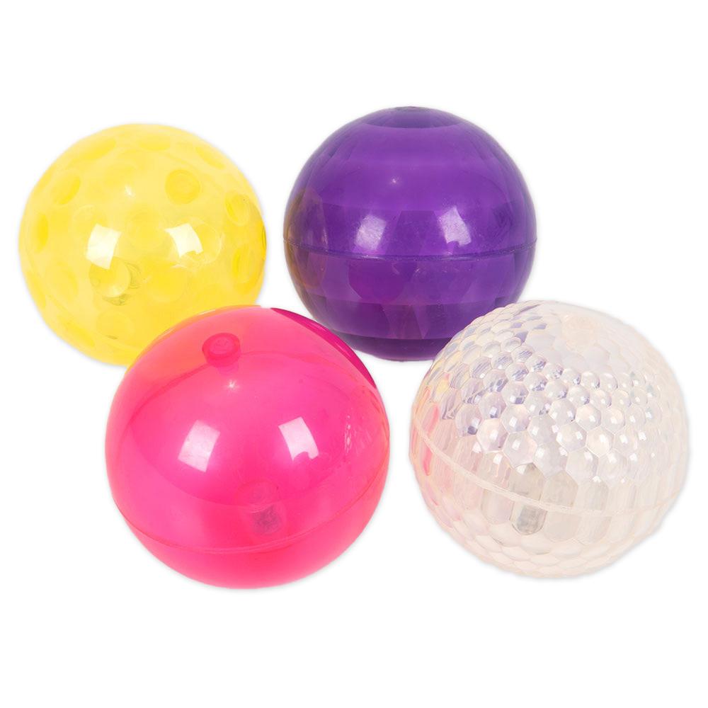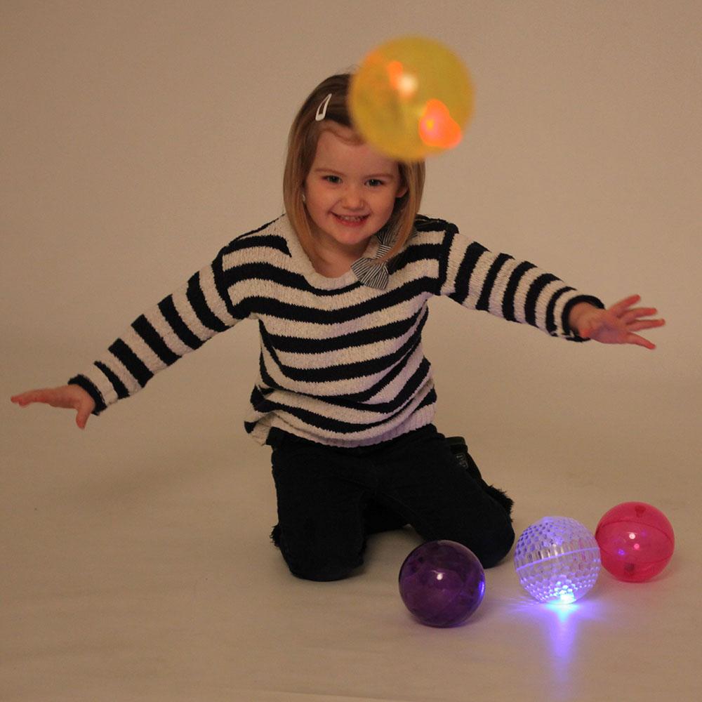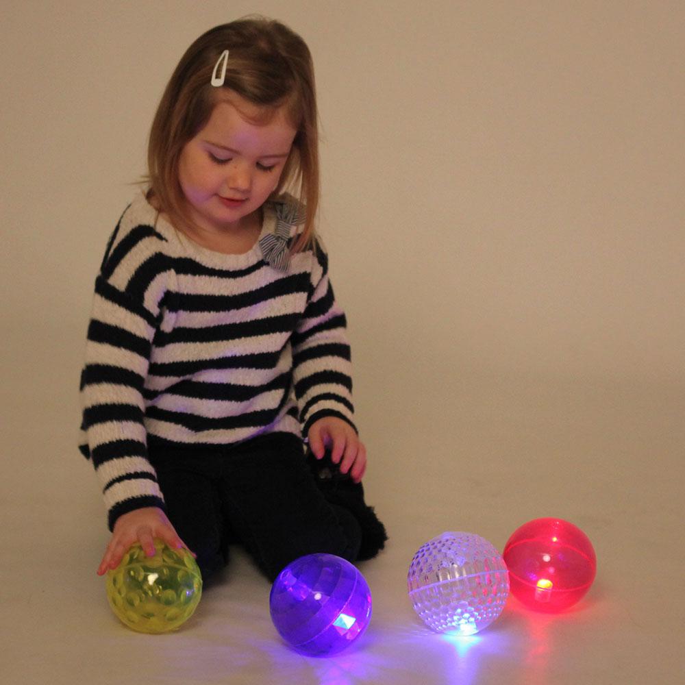 Contiene 4 pelotas sensoriales con diferentes colores, texturas y luces. Su luz es a través de un led con una duración aproximada de 1200 ciclos de parpadeo.